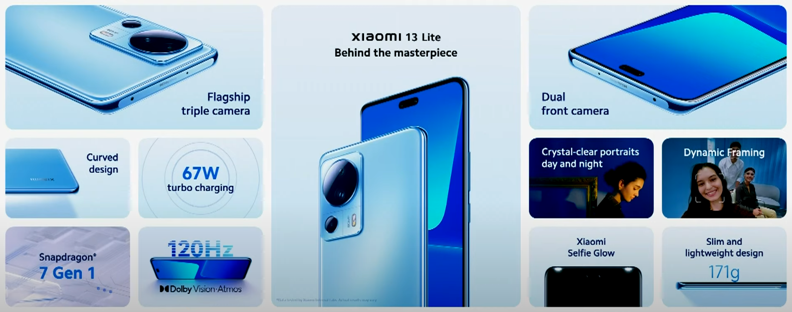 샤오미 13 시리즈의 최하위 모델인 13 Lite 모델은 사실 작년 중국 내수용으로 출시했던 Civi 2를 글로벌버전으로 리네이밍한 모델로, 가장 큰 차이점이라 카메라 부분으로 중국 내수용은 후면 메인 카메라와 초광각은 5천만, 2천만화소로 적용한 반면, 13 Lite는 초광각은 800만으로 다운그레이했다. 그래도, 전면카메라는 중국 내수용과 동일하게 3200만 듀얼 카메라를 유지했다. 이외에는 6.55인치 아몰레드 디스플레이에, 120Hz 화면주사율, 스냅드래곤 7 Gen1 APU, 4500mAh 배터리용량, 67W 고속충전 등 나머지 사양들은 모두 중국 내수용과 동일하다.