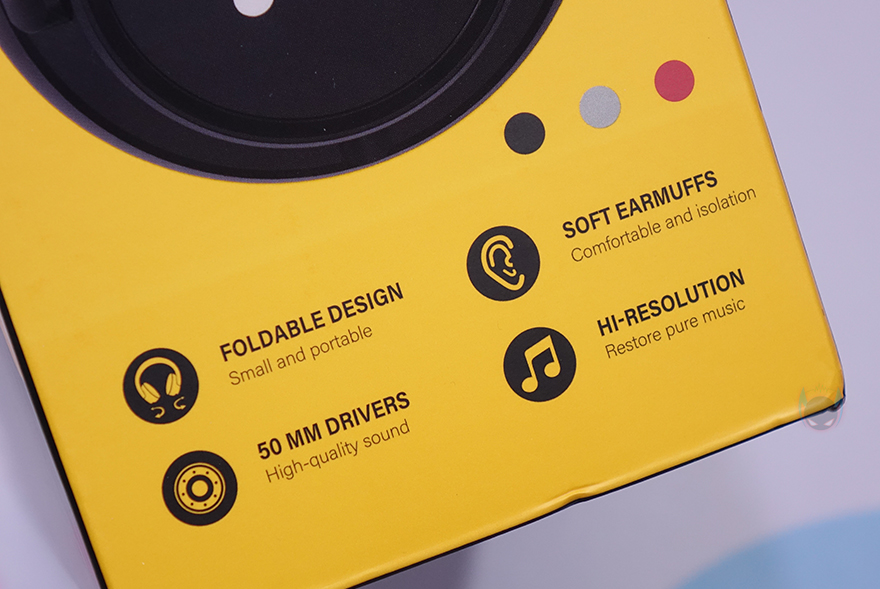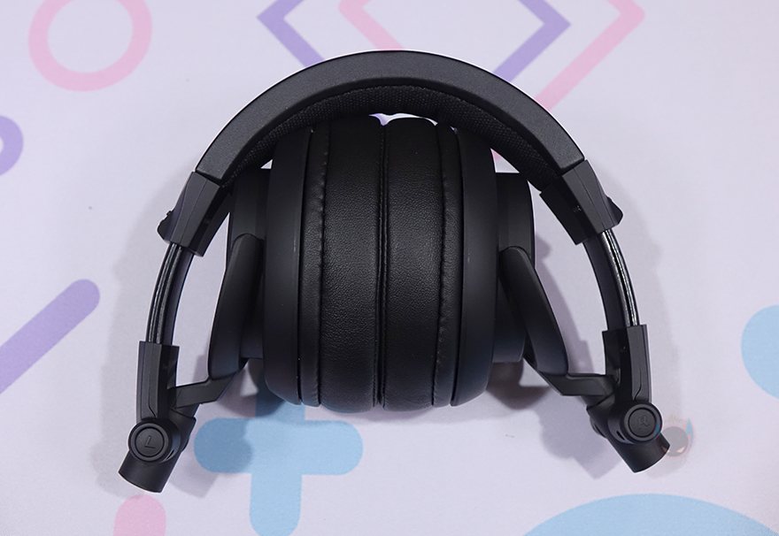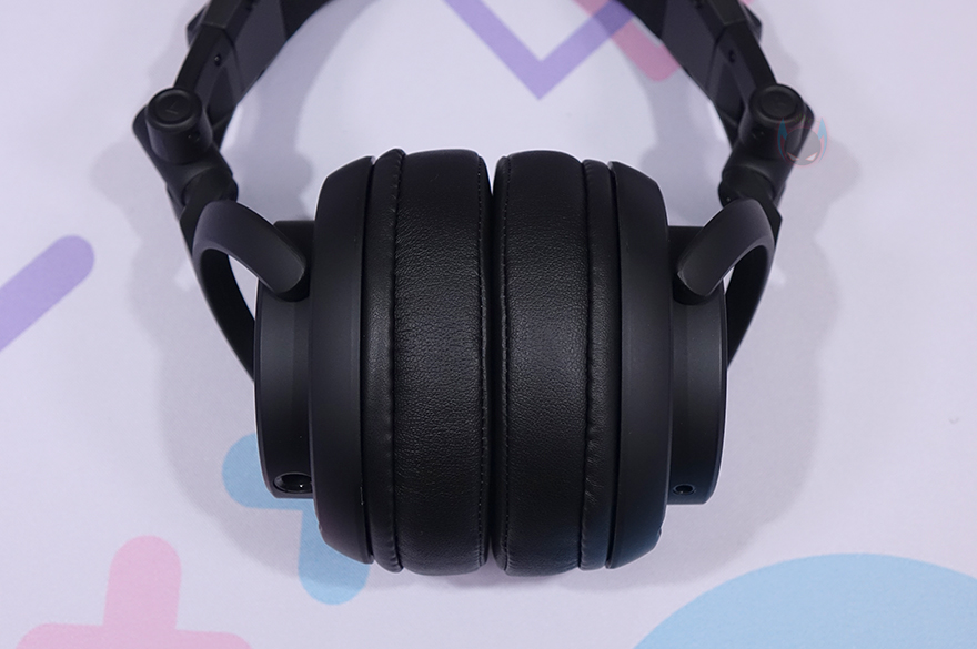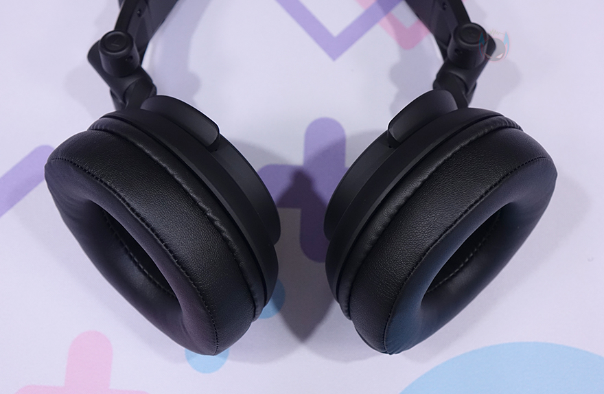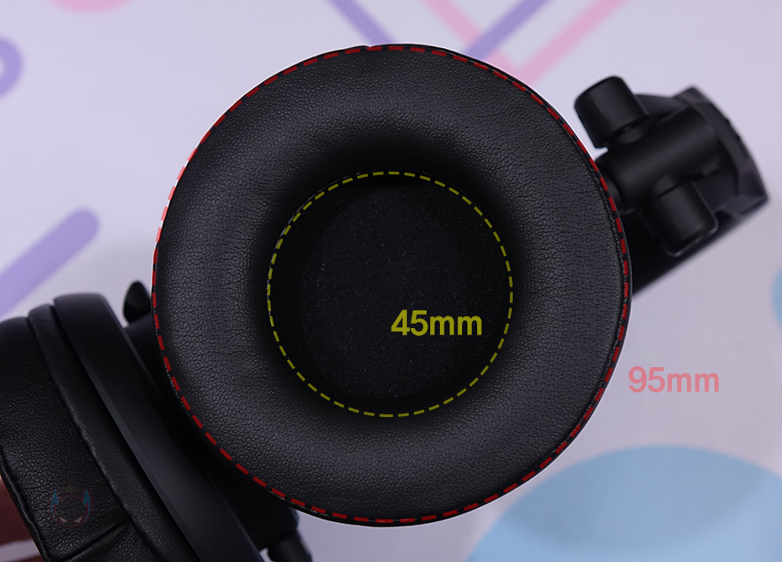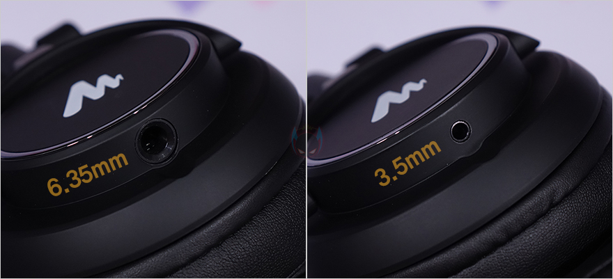 이어-컵(Ear-cup)은 양쪽 모두 바깥쪽에 로고(Logo)를 새겨놨으며, 로고 주변 유광처리된 링-부분이 제품 색상 구분이되는 위치죠. 안쪽 이어-패드(Ear-pad)는 당연히 쿠션처리로 마감소재는 인조가죽이며, 귀를 완전히 덮는 밀폐형으로 패드 크기는 약 95mm이고, 귀를 덮는 홈의 면적은 약 45mm입니다. 참고로 내부에는 50mm 드라이버 유닛(driver unit)이 내장되어 있으며, 주파수대역은 20Hz-20kHz, 임피던스는 32Ω입니다. 또한, 양쪽 이어-컵 아랫쪽에는 각각 오디오-잭(Audio-jack)이 적용되어 있는데, 왼쪽은 오디오 인터페이스나 전자 기타 같은 악기에 연결할 수 있는 6.35mm, 오른쪽은 PC나 모바일 같은 일반적인 오디오 지원 기기에 연결하는 3.5mm 규격입니다.