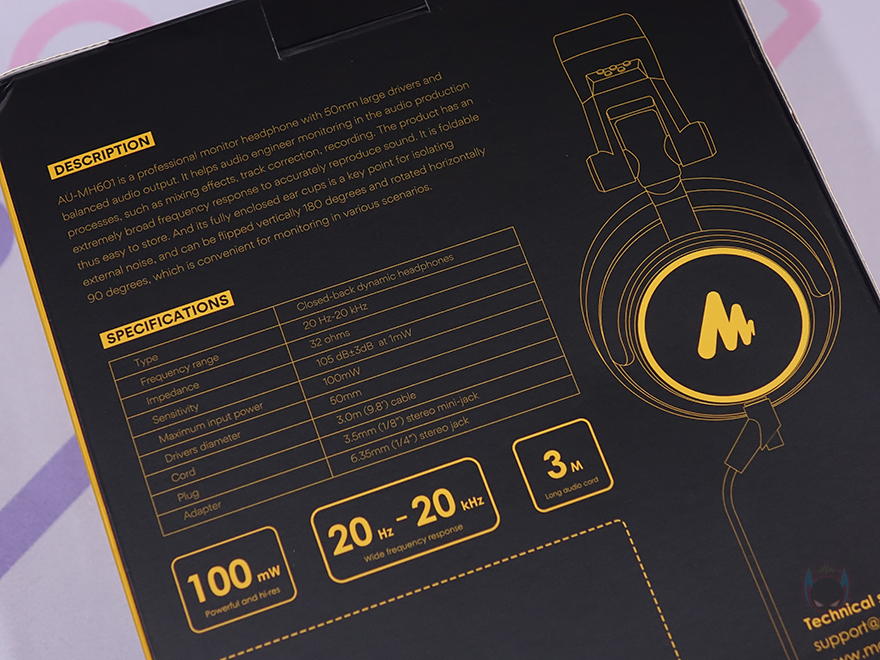 제품박스부터 살펴보면, 전면에는 제품 이미지를 담고 있으며 모델명도 확인할 수 있습니다. 시작에서 AU-MH601 헤드셋을 게임과 오디오 겸용을 지원한다고 언급했지만, 그래도 둘 중 하나는 기본 컨셉을 잡아야 하니깐 모델명 아래에 '스튜디오 헤드폰(Studio Headphone)'이라고 표기를 해놓은 것도 확인할 수 있죠. 박스 한쪽 측면에는 헤드셋 측면 이미지를 담으면서 색상구분과 주요 특징을 표기해 놨습니다. 또한, 반대쪽 측면에도 제품 특징을 표기해 놨는데, 좀 더 상세하게 언급하고 있죠.