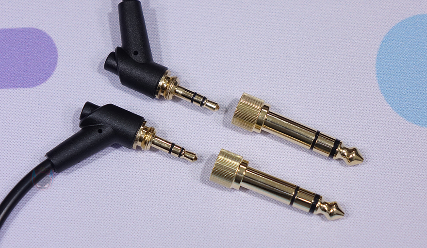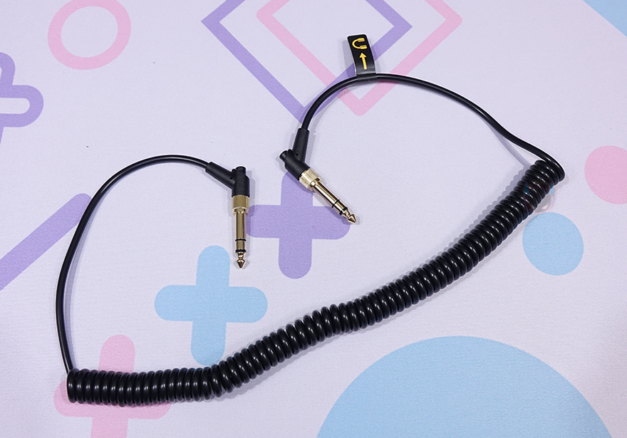 그리고, 이어-컵의 수직 각도를 조절할 수 있는 틸트 같은경우에는 360˚로 회전할 수 있어서, 이어-패드를 완전히 바깥쪽 방향으로 바꿀 수 있는데, 이렇게 회전을 지원하는 이유는 헤드셋을 파우치 같은 곳에 보관하거나 담아서 휴대할 때 최대한 부피를 줄이도록 접을 수 있게 하기 위함입니다. 끝으로, 오디오 케이블 같은 경우에는 총 3m 길이에 앞서 오디오-잭을 확인했듯이 양쪽 인터페이스에는 6.35mm 플러그-어댑터(plug adapter)가 적용되어 있으며, 어댑터를 풀면, 기본 3.5mm 플러그(Plug)를 확인할 수 있으며, 두 플러그 모두 신호손실 최소화를 위해 금-도금(gold plated) 처리가 적용되어 있죠. 또한, 케이블 한쪽에는 헤드셋과 기기 연결을 구분하는 태그도 부착되어 있습니다.