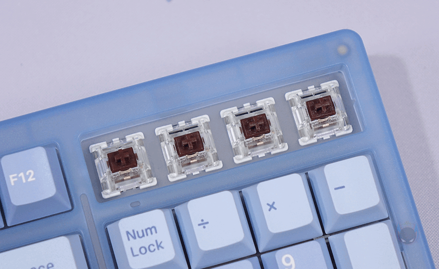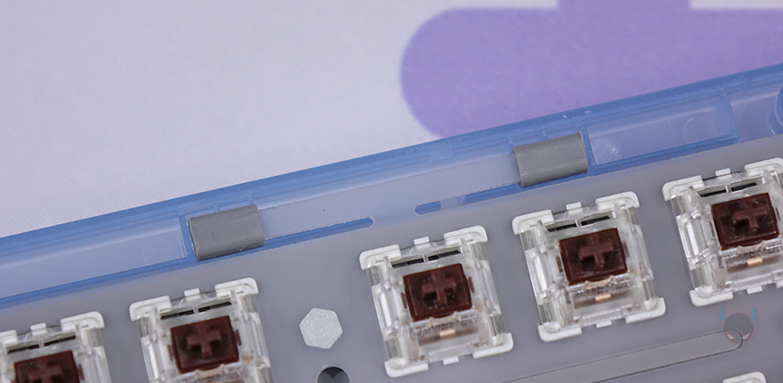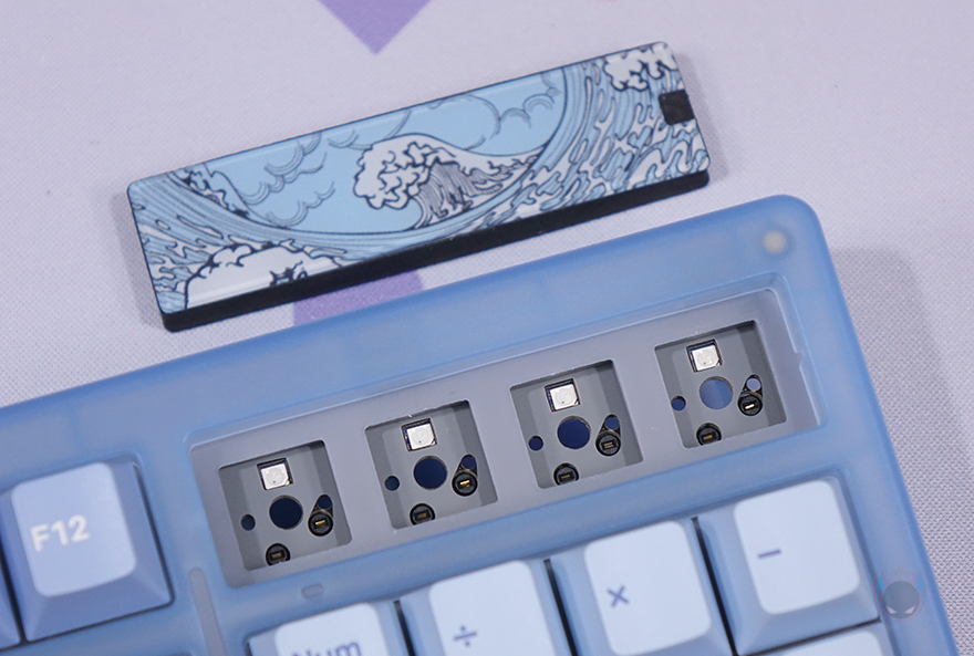 키-캡(Keycap) 모두 블루색상 계열이지만 톤이 서로 다른 3가지 컬러톤(triple color tone)으로 재질은 PBT입니다. 물론, PBT재질이기때문에 이중사출(Double Shot) 방식으로 처리되어 있으며, 외내 모두 100% 채워진 형태라 두께도 약 1.5mm로 두터운 편이죠. 그리고, KEYNOVO IF98 Pro 키보드의 스위치는 모두 게이트론(Gateron) 스위치이며, 요즘 소비자들에게 인기가 많은 G Pro 시리즈로 구매 시 흑축(Black)/갈축(Brown)/적축(Red)/황축(Yellow) 중에 선택할 수 있습니다. 또한, 스위치 역시 핫-스왑(Hot-swap) 방식이라 리무버를 사용해 쉽게 빼낼 수 있으며, 스위치를 빼내면 PCB 기판에 SMD LED와 함께 5개의 구멍을 확인할 수 있어서, 3pin과 5pin 스위치 모두 호환이 된다라는 것을 확인할 수 있죠. 실제로 다른 스위치들로 모두 호환이 되는 것을 확인할 수 있었습니다. 그리고, 스페이스-바 같은 스테빌라이저(Stabilizer)는 체리식이고, 윤활(Lubed)도 기본 처리되어 있죠. 뿐만 아니라 통울림 최소화를 위해 스페이스-바 공간 사이에 실리콘 흡음재도 삽입해 놨습니다.