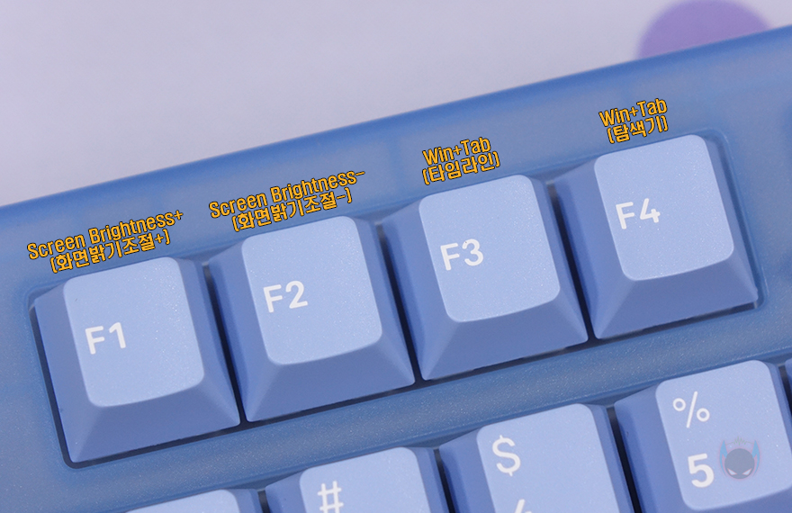KEYNOVO IF98 Pro 키보드 역시 Fn키를 갖추고 있어서 부가 기능들을 지원해주고 있는데, A와 S키는 윈도우(Windows)와 맥(Mac) 운영체제 시스템이 맞게 레이아웃 전환할 수 있으며, ESC 키와 Win 키는 다른 키보드 제품들처럼 설정초기화(Reset)와 잠금/해제(Lock/Unlock) 기능을 가지고 있습니다. 그리고, 윈도우와 맥 레이아웃 상관없이 F숫자키들은 동일한 기능을 가지고 있는데, F1~F2키는 화면밝기조절, F3키는 타임라인(Timeline), F4키는 탐색기, F7~F9키는 재생컨트롤(Play control), F10~F12키는 음소거 및 볼륨조절 기능을 가지고 있습니다.