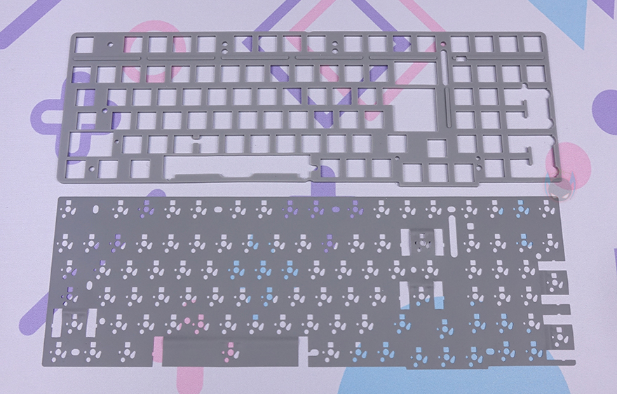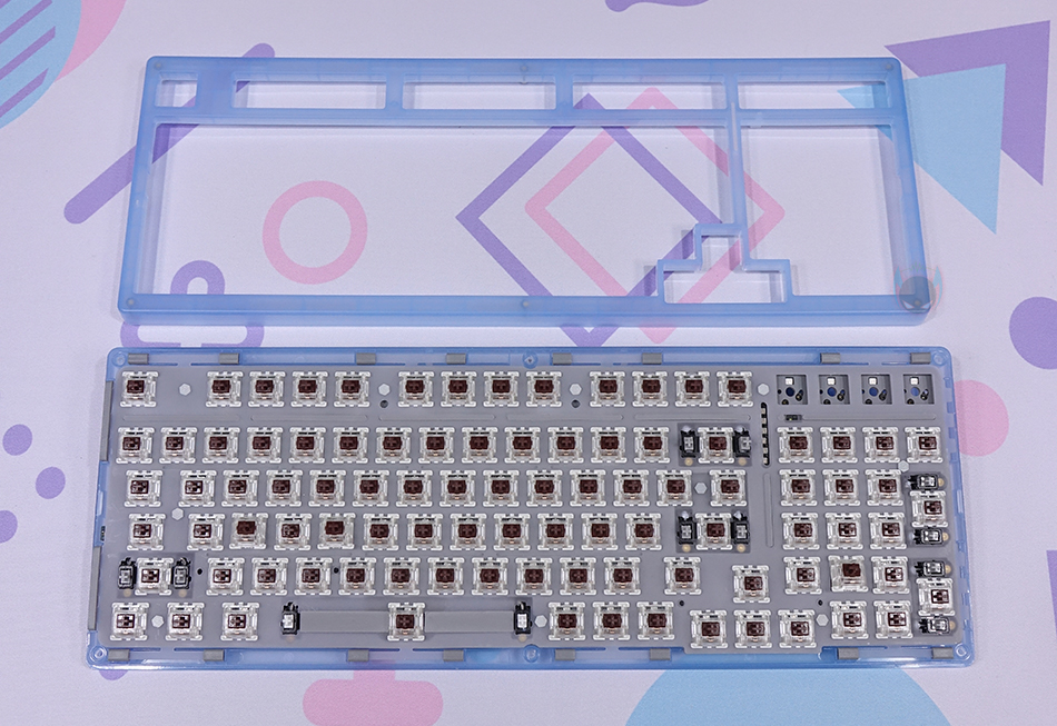 YUNZII KEYNOVO IF98 Pro 키보드는 밑바닥에 나사를 풀면 분해가 가능한데, 일단 상판 케이스를 분리하면 폴리카보네이트 재질의 플레이트(PC Plate)를 가장 먼저 볼 수 있는데, 테두리 주변 그러니깐 케이스 하우징 부분으로 실리콘 가스켓(Silicone Gasket) 소재가 장착된 것을 확인할 수 있습니다. 그리고, 하판 케이스까지 분리하면, 하판에 내장된 3,000mAh 용량의 배터리를 확인할 수 있죠. 그리고, PCB기판까지 분리를 하면 앞서 외부에서 확인하지 못한 나사방식의 스테빌라이저(Screw-in Stabilizer)를 확인할 수 있고, PC Plate를 분리하면 3.1mm 두께의 실리콘 PCBA 흡음재를 확인할 수 있으며, 다시 여기서 한 번 분리하면 0.4mm 두께의 실리콘 흡음재(Sound Absorbing Foam)를 확인할 수 있습니다. 전체적으로 요즘 키보드의 트렌드인 가스켓 하우징을 그대로 적용했다고 보면 됩니다.