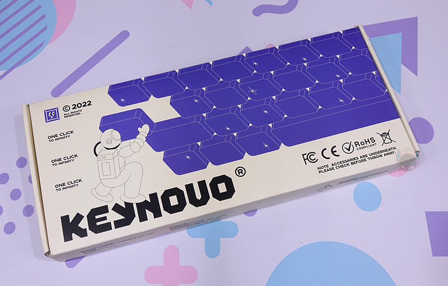 제품 패키지는 겉표지와 속박스로 이루어져 있는데, 디자인은 심플하게 전면에 KEYNOVO IF98 모델명과 제품 이미지만 담고 있으며, Pro 버전이라고 해서 따로 패키지 구분을 하고 있지는 않습니다. 물론, 박스 측면에 제품 표기에서 'IF98 3-Mode'를 확인할 수 있기 때문에, KEYNOVO IF98 Pro 제품이라는 걸 알 수 있죠. 이외에도 색상, 스위치 표기도 확인할 수 있으며, 다른 측면에는 QR코드로 디스코드(DISCORD), 자체샵(Official Store), 인스타그램(Instagram)으로 바로 연결할 수 있게 해주고 있죠. 겉표지를 벗기면 속박스에도 별도의 디자인을 적용하고 있습니다.