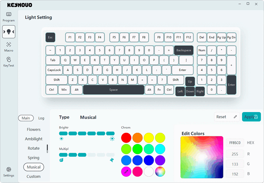 KEYNOVO IF98 Pro 키보드 역시 다른 키보드들처럼 전용 소프트웨어(S/W)를 제공해주고 있습니다. YUNZII 홈페이지에서 다운로드 받을 수 있으며, 설치 설명서대로 먼저 소프트웨어 업그레이드를 설치한 후 프로그램을 설치하면 됩니다. 프로그램을 실행해 보면 메뉴는 크게 Program/Lighting/Macro/Key Test/Setting으로 나뉘며, 키 기능변경을 할 수 있는 Program 메뉴에선 Mainkeys/Media/Mouse/LayerSwitch/Extended/Press Trigger/MacroKey 기능을 지원해주고 있는데, 사용법은 간단합니다. 변경하고자 하는 키를 선택한 후, 기능 선택에서 원하는 기능을 선택하고, 적용(Apply)을 누른 후 맨 오른쪽 상단에 있는 디스크 모양을 누르면 키보드에 저장되면서 기능이 변경됩니다. 이외에 Lighting 메뉴에선 앞서 확인한 RGB 백라이즈 조명과 Log LED 조명 기능을 프로그램에서도 그대로 사용할 수 있는데, RGB 백라이트 같은 경우에는 프로그램에서 추가로 리듬(Musical)과 커스텀(Custom) 효과를 추가로 선택할 수 있으며, Key Test를 통해서는 동시입력 등의 키 정상작동 유무를 쉽게 확인할 수 있습니다.