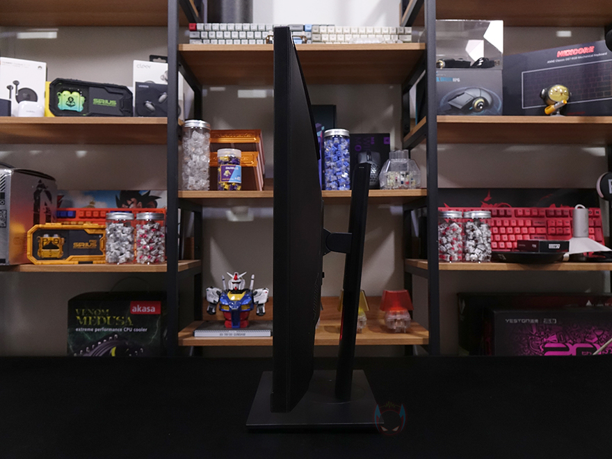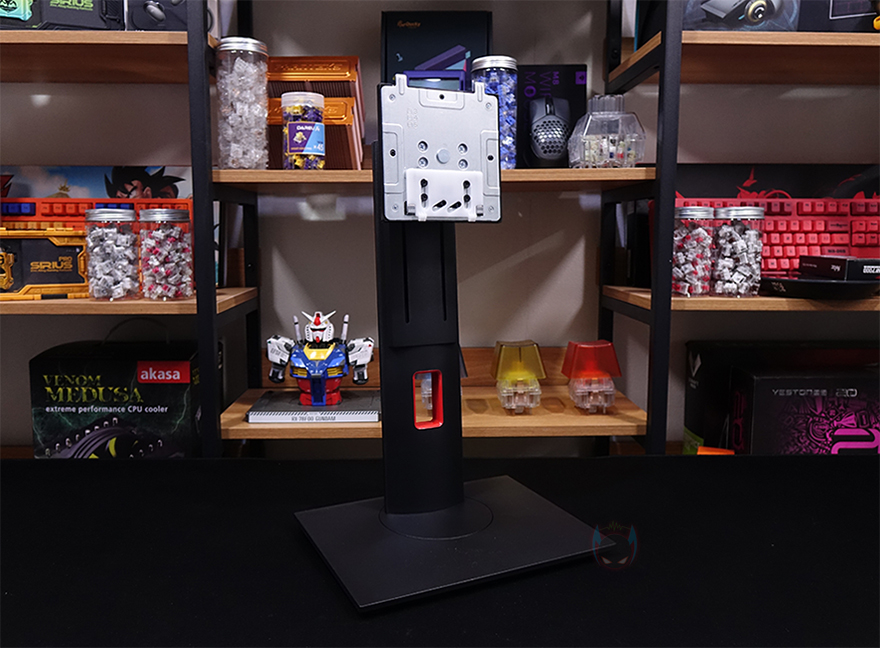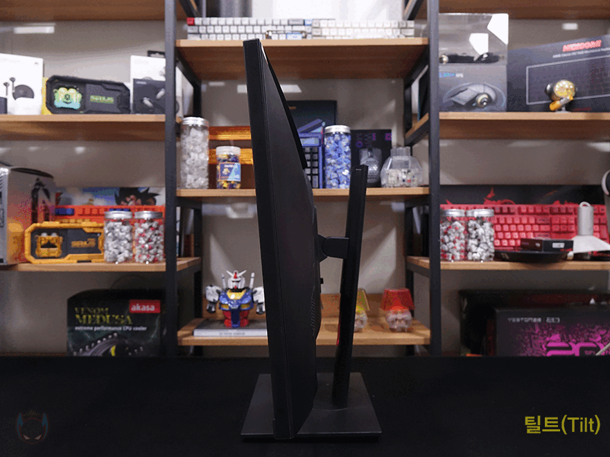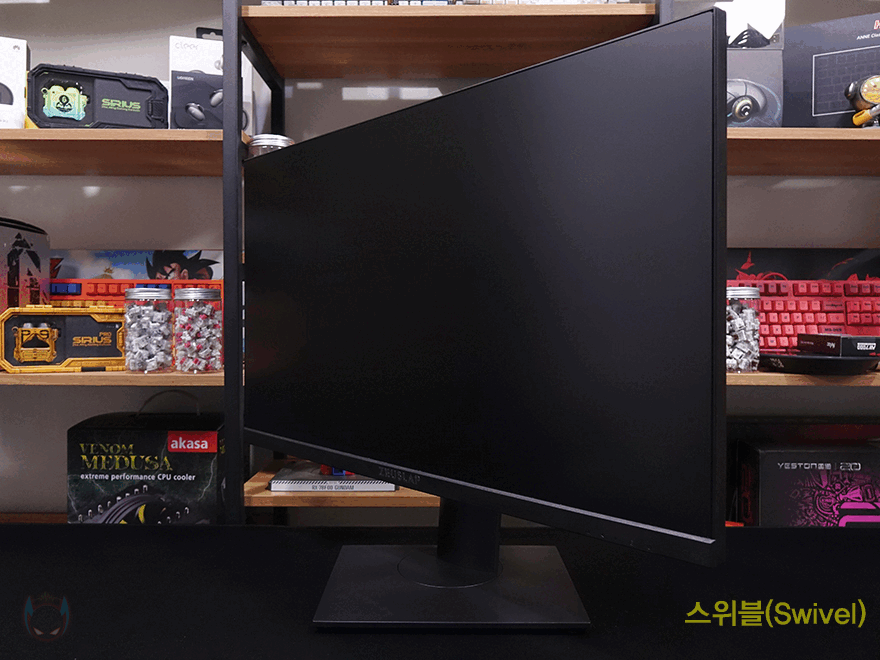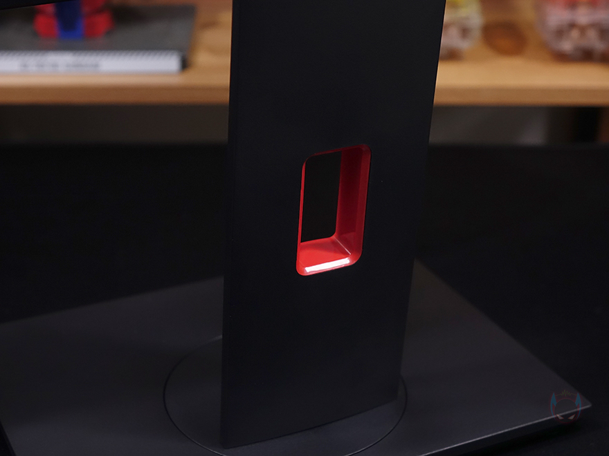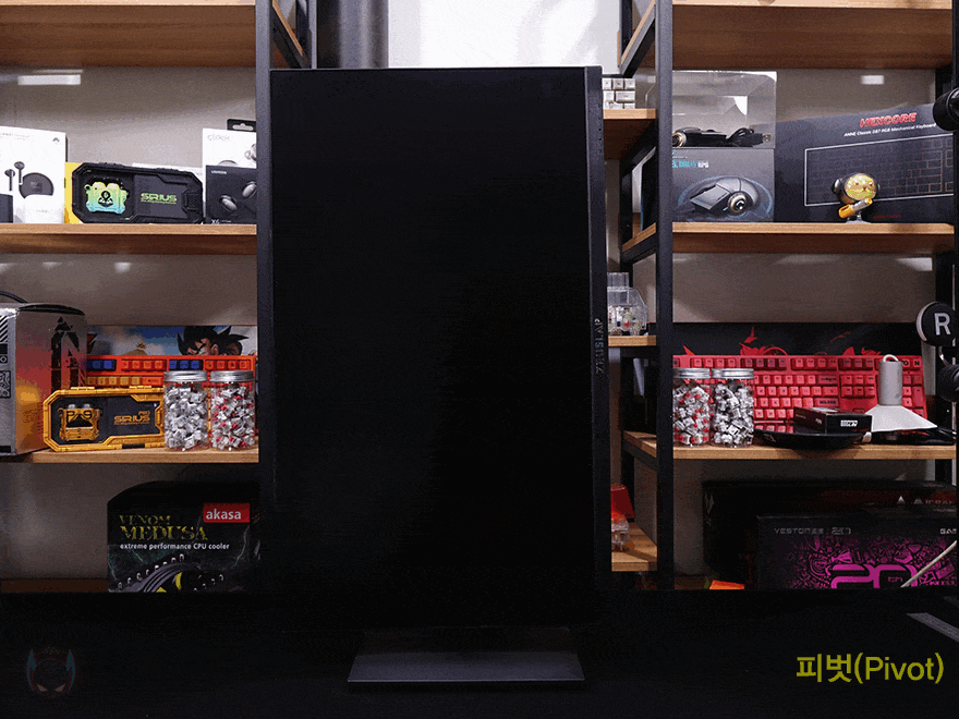 끝으로, 스탠드 부분을 살펴보면, 스탠드 중간 위치쯤에 케이블 정리를 할 수 있게 케이블을 모아주는 홀-처리를 해놨으며, 스탠드 기능으로 틸트(Tilt), 높낮이조절(Elevation), 스위블(Swivel), 피벗(Pivot)까지 모니터 스탠드 기능으로 가질 수 있는 4가지 기능을 모두 갖추고 있습니다.