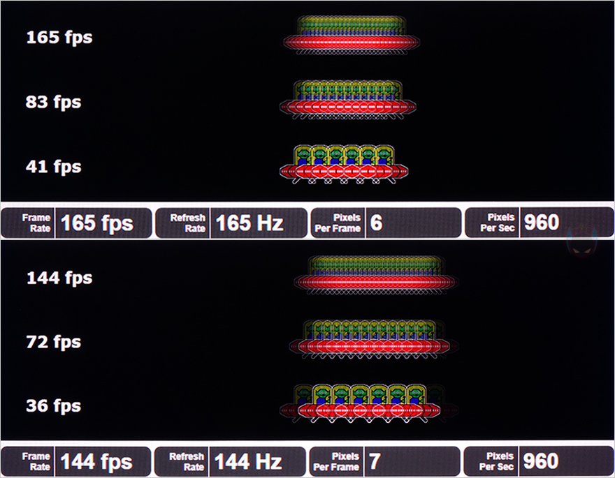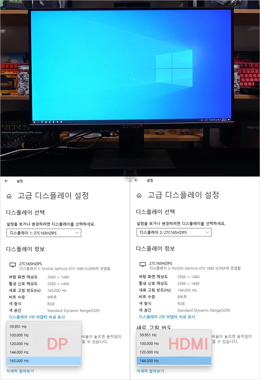 직접, 제우스랩 27인치 게이밍 모니터를 사용해 보면, 일단 전원이 들어보면 모니터 후면의 RGB 조명효과를 바로 볼 수 있습니다. 자동으로 색상이 전환되는 RGB 모드이며, 추가적인 모드는 없습니다. 그리고, 뒤에서 확인하겠지만, OSD 메뉴를 통해 RGB 조명효과를 On/Off 할 수 있죠. 그리고, 운영체제상에서 모니터 주사율을 확인해 보면, DP와 HDMI 연결에 따라서 차이가 있는데, DP 연결 시에는 최대 165Hz 주사율까지 설정이 가능하고, HDMI 연결시에는 144Hz 주사율까지 설정이 가능합니다. 이건 다른 게이밍 모니터 제품에서도 똑같죠. 그리고, 실제로 주사율에 따른 프레임 비교를 해보면, 165Hz 주사율이 144Hz보다 좀 더 촘촘하게 이미지가 처리되는 것을 확인할 수 있습니다. 물론, 둘 주사율 모두 일반 60Hz 주사율보다는 훨씬 높기 때문에 어느 쪽을 선택해도 향상된 체감을 할 수 있죠. 해상도는 당연히 2560x1440의 QHD로 지원해주고 있습니다.