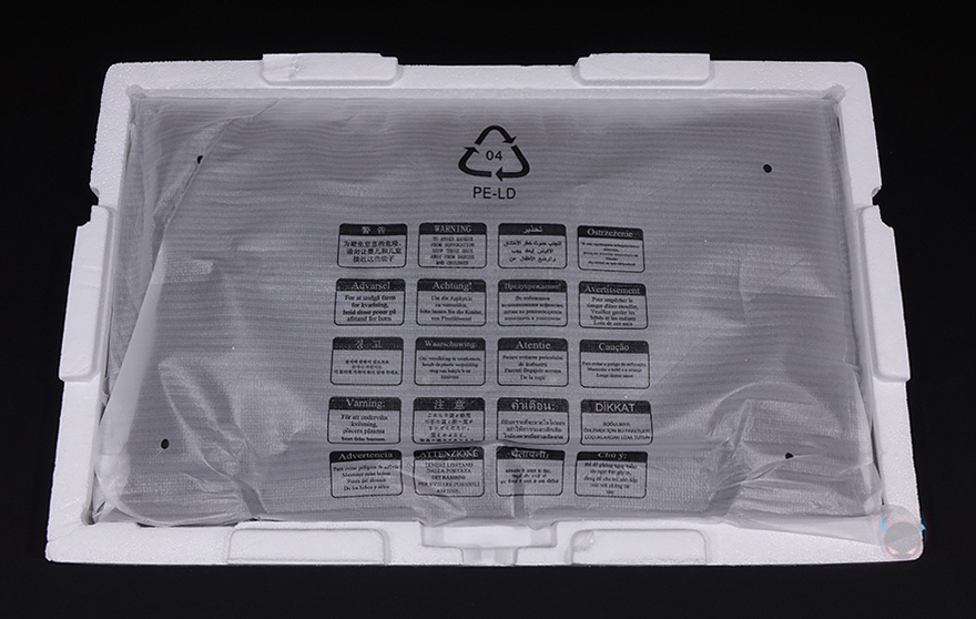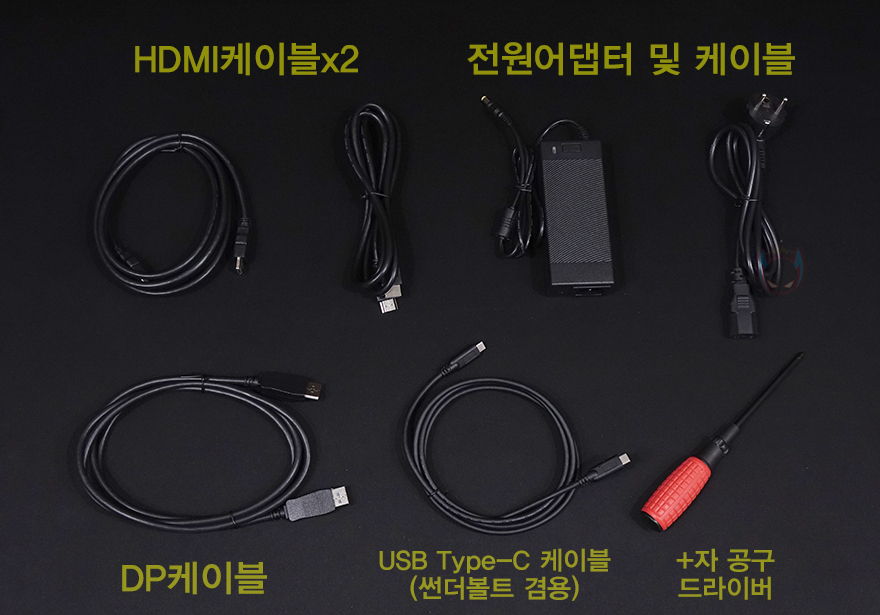 스티로폼 포장재에는 다른 모니터 제품들처럼 공간을 나뉘어서 받침대, 케이블 등의 부속품들이 포장 수납되어 있으며, 패널 부분의 모니터는 스티로폼 안쪽에 비닐포장과 함께 수납되어 있죠. 부속품에는 HDMI 케이블 2개, DP(Display Port) 케이블, 전원 어댑터 및 케이블, 썬더볼트 겸용의 USB Type-C 케이블, +자 드라이버 공구를 제공해주고 있습니다. 물론, 시작에서 언급했듯이 리뷰에 사용된 제품은 샘플이기 때문에 실제 판매 제품 구성과는 차이가 있을 수 있습니다.
