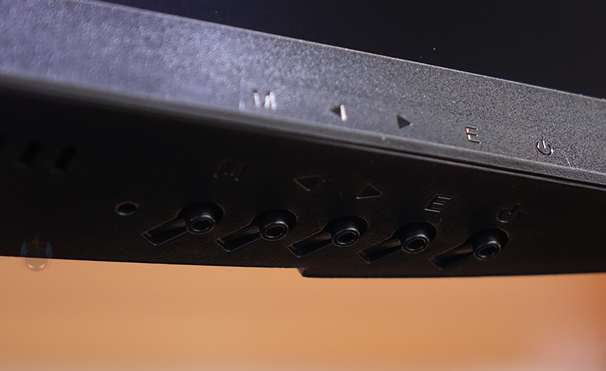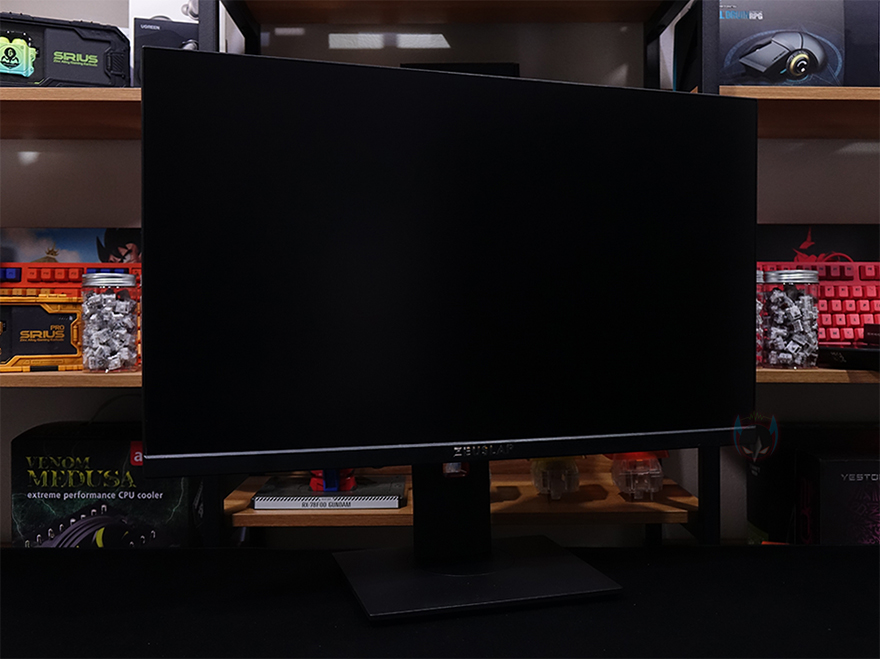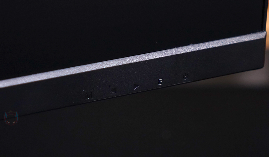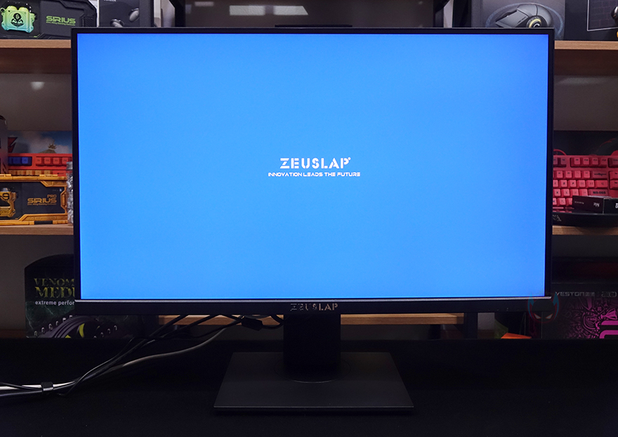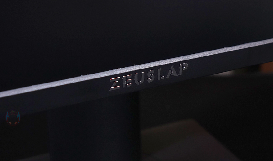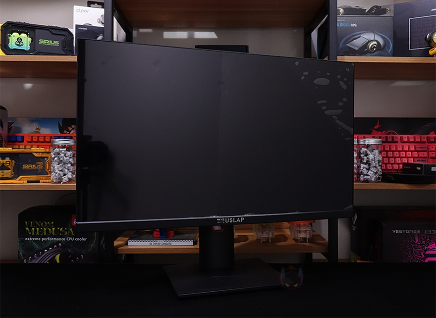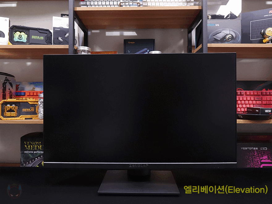 그럼, 본격적으로 제우스랩 27인치 게이밍 모니터를 살펴보는데, 먼저 패널 같은 경우에는 전형적인 27인치 크기로 패널은 방금 언급했듯이 IPS 패널이 사용되었으며, 빛 반사가 없는 논-글래어 패널입니다. 또한, 베젤(bezel) 같은 경우에도 아랫면을 제외한 상좌우 3면이 2mm 두께로 흔히 말하는 제로-베젤(Zero-bezel) 형태죠. 그리고, 아랫면 중앙 위치에는 ZEUSLAP 로고 플레이트를 적용해 놨으며, 맨 오른쪽에는 전원 및 OSD 기능 버튼 표시를 해놨는데, 같은 위치 아랫부분에 버튼들이 배치되어 있습니다.