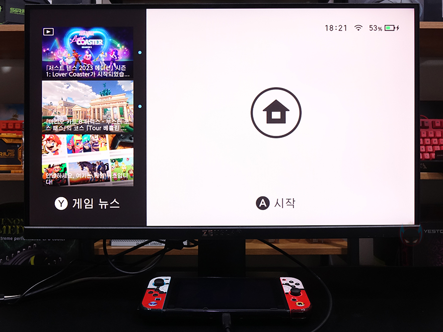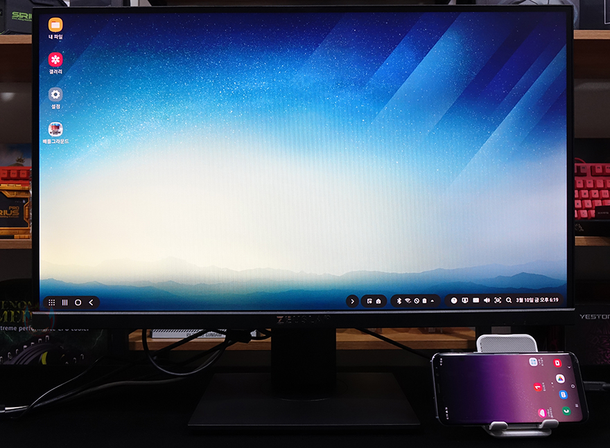 시야각은 앞서 언급했듯이 IPS패널을 사용했기 때문에 178˚의 광시야각을 가지고 있으며, 내장 스피커는 모니터 스피커에서 갖추는 최소 출력을 가지고 있어서, 전문적으로 듣기보다는 그냥 전반적인 사운드를 청취하는 수준으로 생각하면 되겠습니다. 썬더볼트 겸용 지원의 USB Type-C 포트는 PC를 켜지 않은 상태에서 삼성 스마트폰과 연결하면 덱스(Dex) 실행으로 바로 사용할 수 있고, 닌텐도스위치 같은 콘솔기기 역시 충전독 없이도 본체와 연결해서 바로 모니터 확장으로 사용할 수 있습니다. 또한, 모니터를 사용하고 있는 중에는 고속충전으로도 사용할 수 있죠. 물론, USB Type-B와 Type-A 포트도 갖추고 있어서, USB 허브로 키보드/마우스나 USB 메모리 같은 장치를 연결해서 사용할 수 있는데, 조금 아쉬운 점이라면, USB 허브 사용을 위해서 USB Type-B에 사용되는 케이블이 별도로 있어야 합니다.