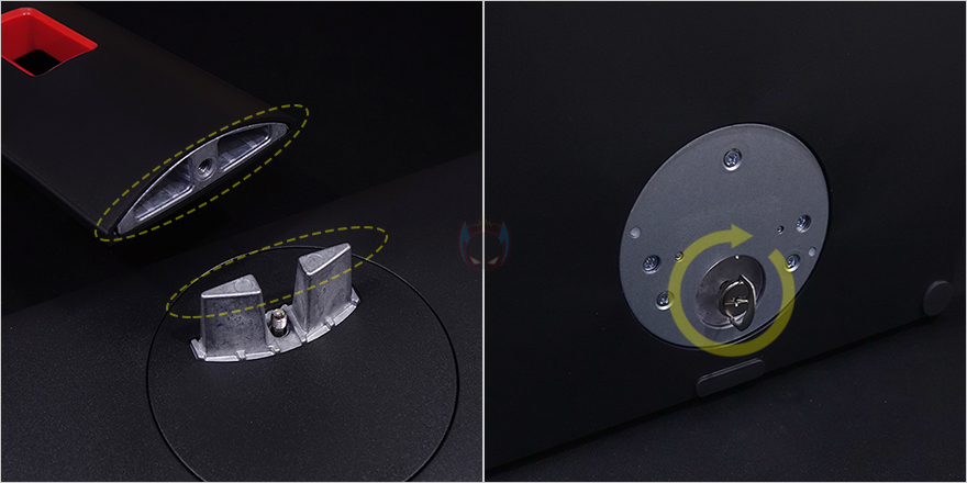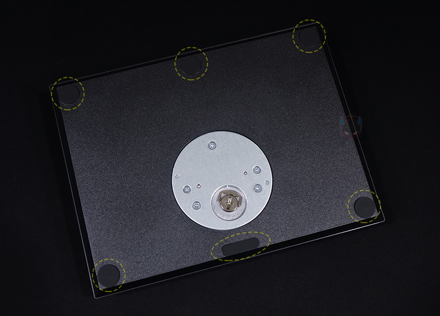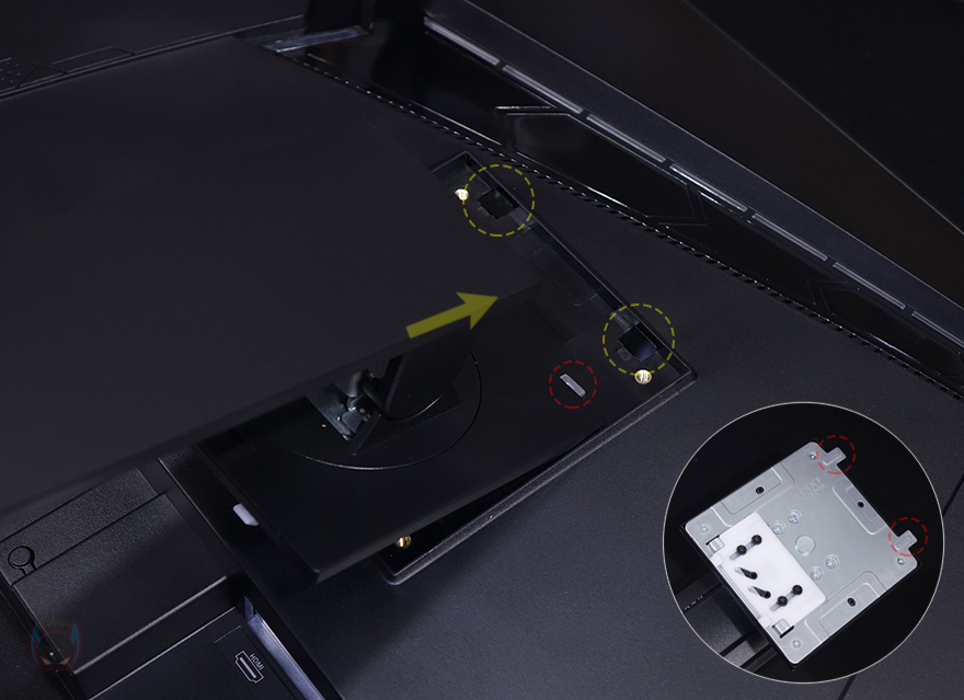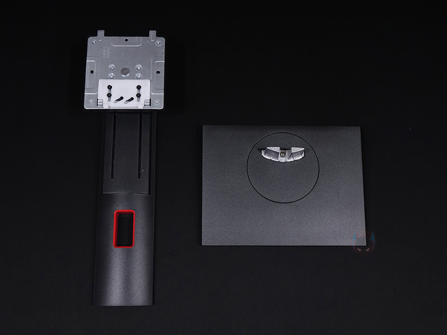 제우스랩 27인치 게이밍 모니터 역시 사용 전에 스탠드 조립을 먼저 해야 하는데, 스탠드 바닥 받침대에는 미끄럼방지 패드를 총 6개 부착해 놨으며, 스탠드와 바닥 받침대 연결은 간단합니다. 연결부의 모양을 맞춰서 끼워준 후, 바닥 받침대 아래에 있는 손잡이 나사를 돌려주면 고정이 되죠. 그리고, 스탠드와 모니터 후면 연결 역시 대각선 방향으로 들어가면서 홈에 서로 맞추고 아래로 내리면 결합이 됩니다. 다른 모니터 스탠드 조립과 비슷하기 때문에 크게 어려운 부분이 없습니다.