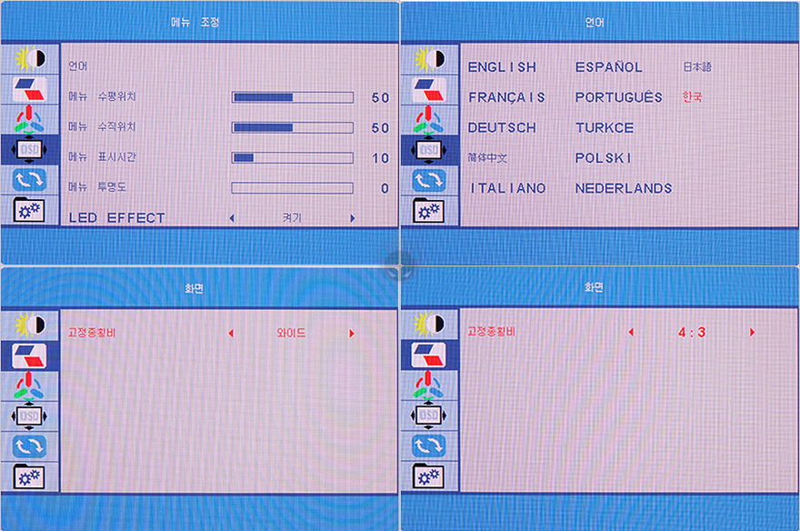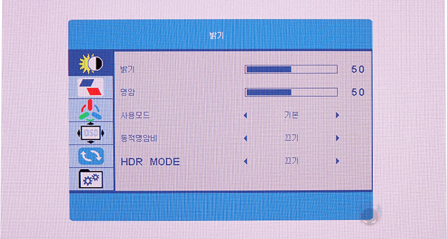 이번엔 모니터의 OSD 메뉴를 살펴보는데, 메뉴는 크게 6가지로 분류되며, OSD 언어에 한국어도 포함되어 있습니다. 또한, OSD 메뉴를 위치이동 할 수 있으며, 앞서 확인한 모니터 후면의 RGB 조명효과 역시 LED EFFECT 메뉴에서 On/Off 할 수 있죠. 또한, 화면 비율 역시 기본 16:9의 와이드와 4:3 비율로 전환할 수 있습니다. 또한, 화면 모드 같은 경우에는 총 6가지 모드를 제공해주고 있는데, 기본/게임/영화/문서/FPS/RTS 모드 기본과 게임은 동일하며, 나머지 각 모드들은 밝기와 색온도의 차이를 보여줍니다. 또한, HDR 모드 역시 자동으로 적용해 주는 AUTO와 비디오 콘텐츠 HDR에 맞추는 HD 2048 모드도 갖추고 있죠.