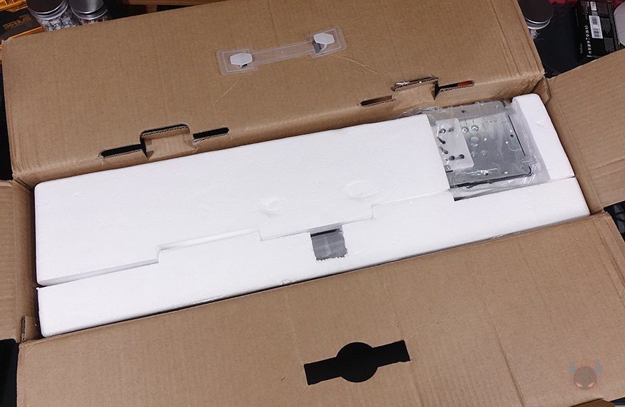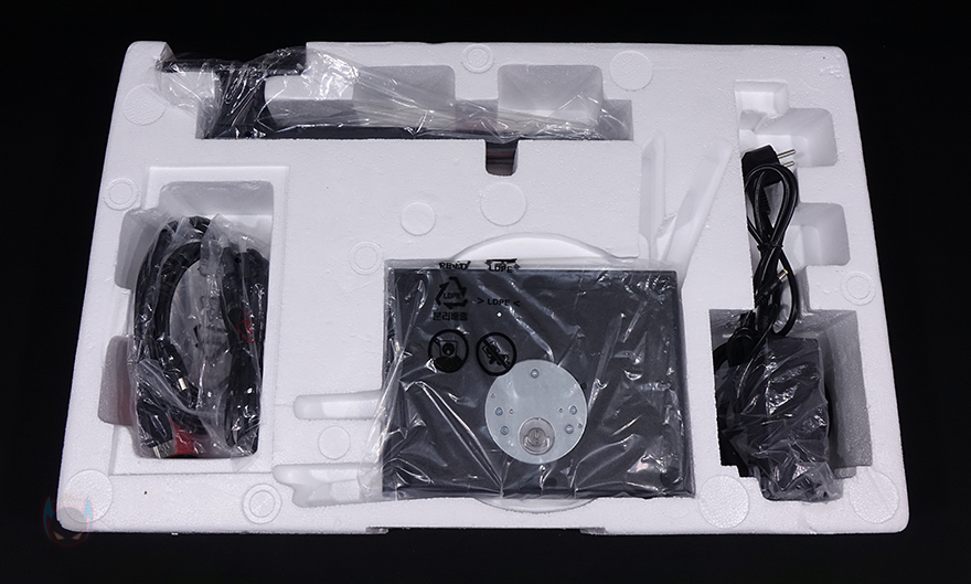 제품을 살펴보기전, 리뷰에 사용된 제품은 샘플 제품이기 때문에 출시 제품과는 포장이나 구성품에 차이가 있을 수 있습니다. 그래서, 리뷰에 사용된 제품 같은 경우 별도의 박스 디자인이 없죠. 그래도, 데스크탑 모니터 제품이기 때문에 이동시 편의를 위해 손잡이가 적용되었고, 박스를 열어보면 포장도 외부 충격방지를 위해 스티로폼이 사용되었습니다.
