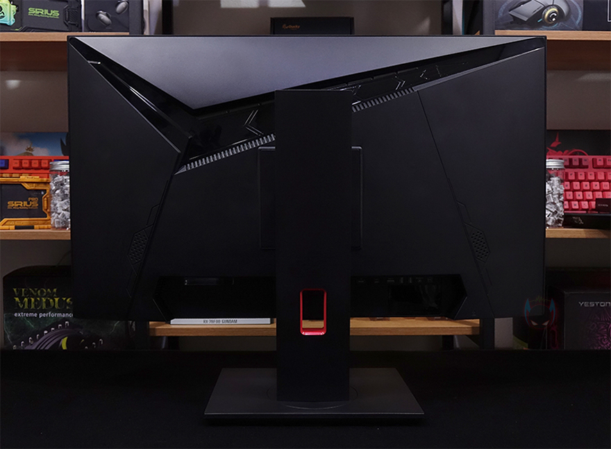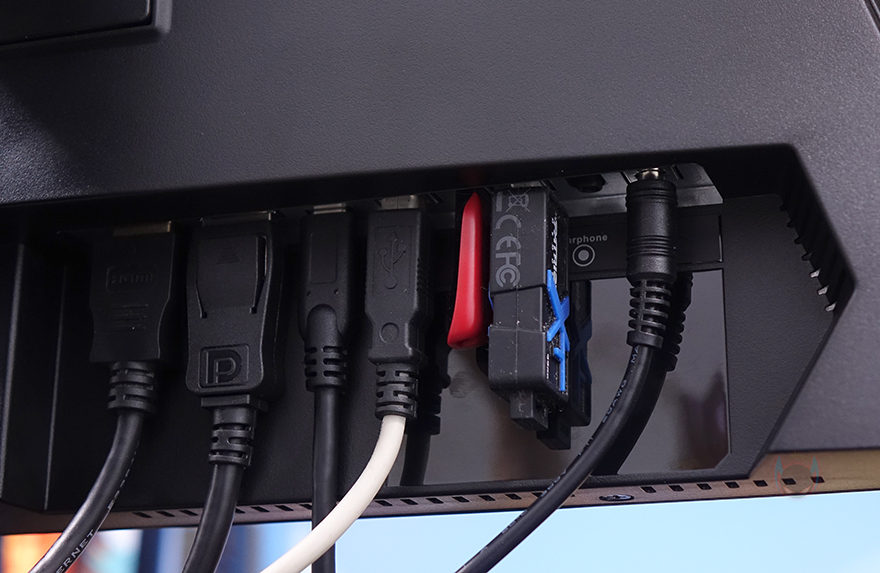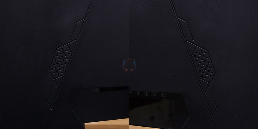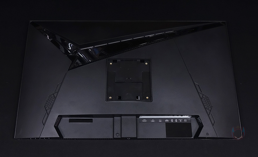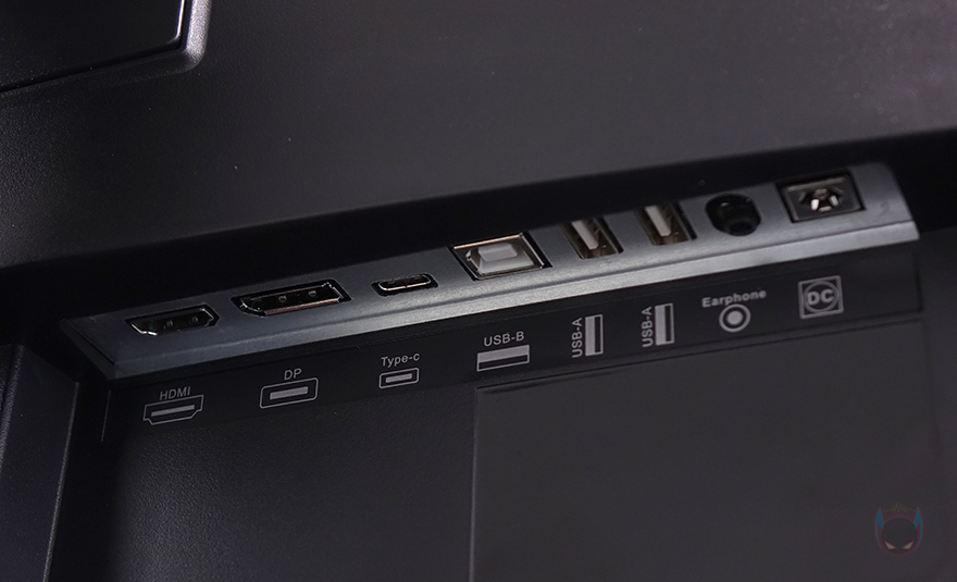 모니터 측면을 보면 게이밍 모니터에서 많이 볼 수 있는 후면이 볼록한 형태이며, 후면을 살펴보면, V자형의 유광처리된 부분은 뒤에서 확인하겠지만, RGB 조명효과가 적용되어 있습니다. 또한, 후면 양쪽 아래쪽에는 2W 출력의 내장 스피커도 적용되어 있죠. 그리고, 모니터 출력 및 전원 등의 포트는 스탠드 기준 후면에서 봤을 때 오른쪽에 배치되어 있는데, 모니터 출력포트는 HDMI, DP 포트로 갖추고 있으며, 그 옆으로 썬더볼트 겸용 지원의 USB Type-C 포트, USB 허브 지원의 USB Type-B, USB Type-A 포트 2개, 스피커 및 헤드셋 연결의 오디오 포트, 전원 포트순으로 배치되어 있습니다.