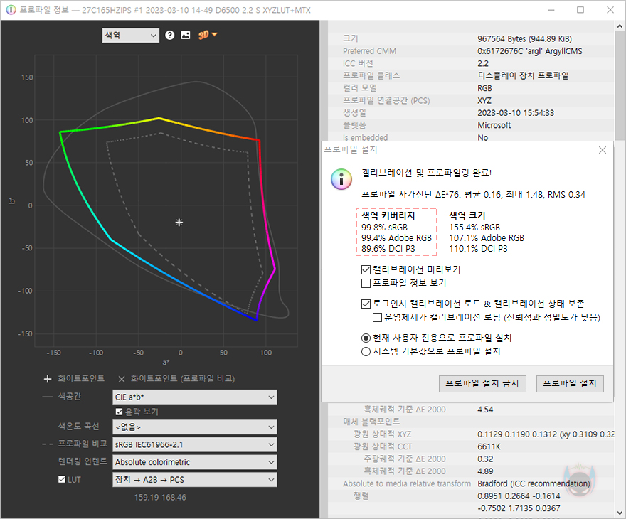 이번 제우스랩 27인치 게이밍 모니터의 색재현율을 측정해 봤는데, 측정결과 sRGB 99.8%, DCI-P3 89.6%, Adobe RGB 99.4%로 게이밍 모니터 역할뿐만 아니라 사진이나 동영상 편집 같은 작업용으로 사용하기에도 수준 높은 색재현율을 가지고 있어서, 다용도로 사용하기에도 무난하겠습니다.