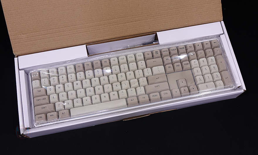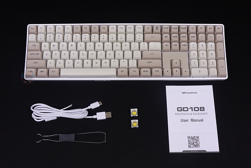 제품 포장 역시 GD100과 동일하게 속박스를 한 번 더 적용한 방식으로 속박스를 열어보면, 비닐포장된 GD108 키보드를 확인할 수 있고, GD108 역시 사이즈에 맞춘 투명 루프를 기본 제공해주고 있습니다. 제품 구성도 키보드를 제외하면 GD100과 동일하게 갖추고 있죠. 분리형 USB 전원 및 충전케이블, 키캡&스위치 리무버, 추가 여분 스위치, 제품설명서.
