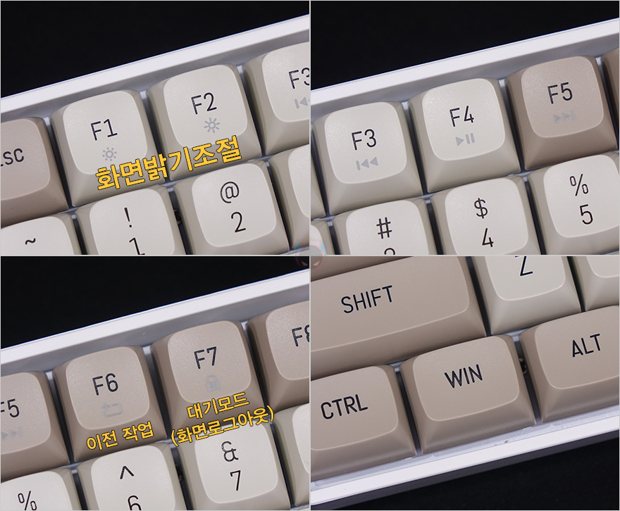물론, 다크플래쉬 GD108 키보드 역시 Fn키를 갖추고 부가 기능을 지원해주고 있는데, GD100과 동일하게 F1~F2키는 화면밝기 조절 기능이며, F3~F5키까지는 재생 컨트롤, F6키는 캡처, F7키는 화면로그아웃 기능을 가지고 있습니다. F1~F2키를 제외하면 방금 확인했던 독립 실행키들까지 포함해 GD100보다 부가기능 사용이 편리합니다. 물론, 윈도우키도 Fn키 조합으로 잠금/해제됩니다.