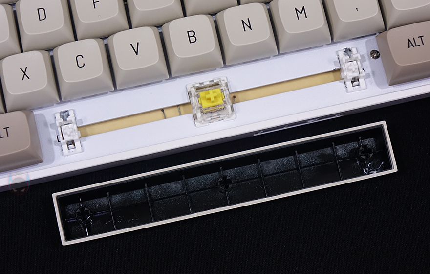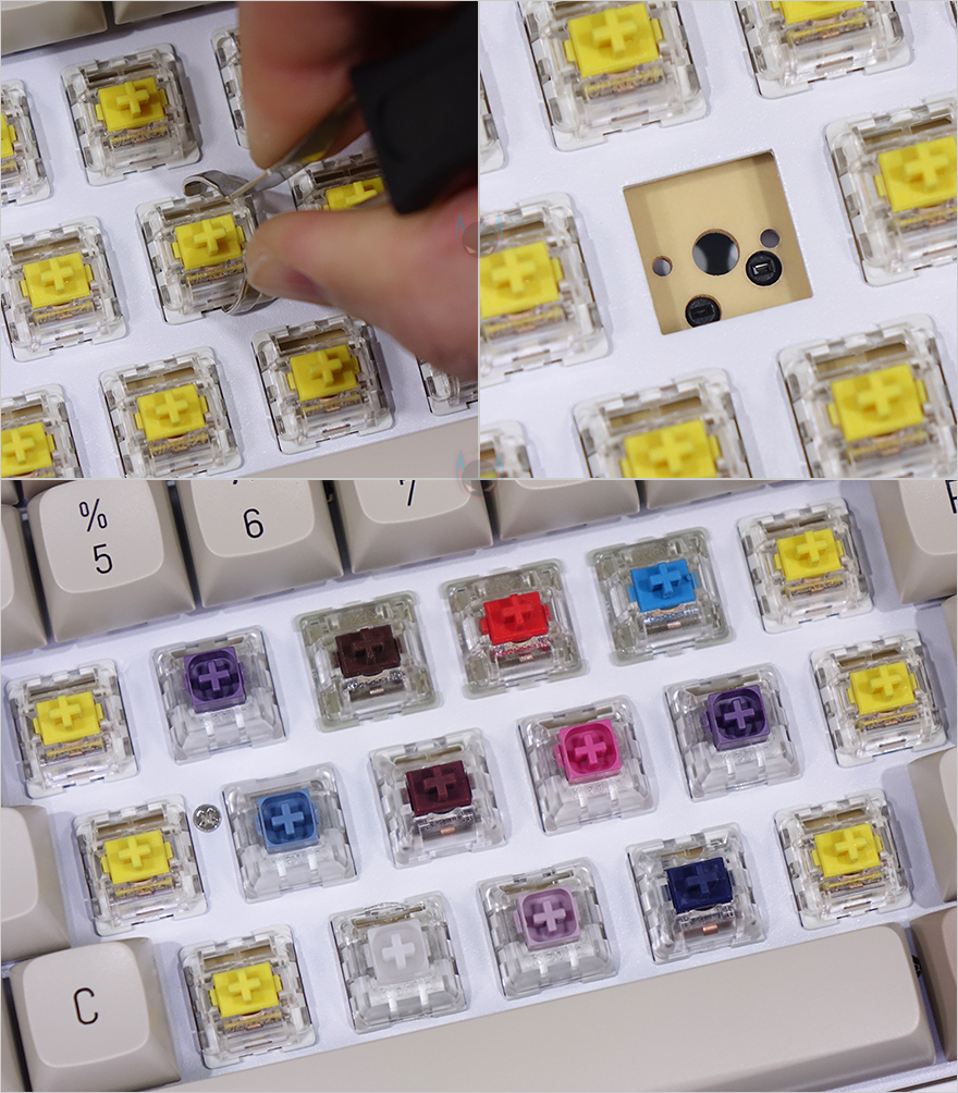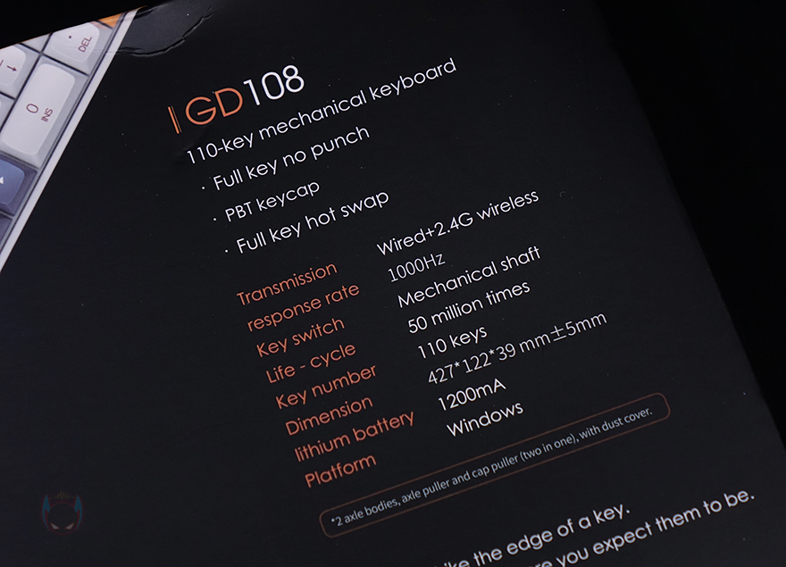 그리고, 키캡은 역시 GD100과 동일하게 PBT 이중사출 방식으로 처리되었으며, 스위치 역시 동일하게 JERRZI 스위치의 리니어 타입 황축으로 출시되었으며, 핫-스왑 방식으로 역시 스위치 분리가 가능합니다. 하지만, GD100와 달리 GD108 같은경우에는 3핀 외에도 5핀 스위치까지 호환이 가능하죠. 물론, GD108도 LED가 없어서 백라이트 효과 기능이 없기 때문에, 일부 소비자들에겐 아쉬울 수 있습니다. 그리고, 스테빌라이저는 체리식이고 기본 윤활처리도 되어있죠.