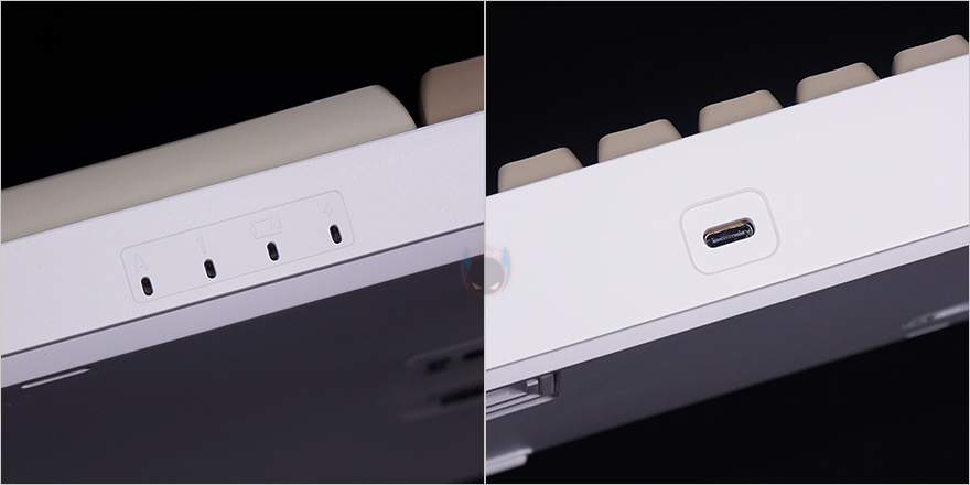 다크플래쉬 GD108의 키보드 케이스 디자인 역시 GD100과 동일하게 전면에는 분리형 USB 전원 및 충전케이블과 연결되는 USB Type-C 포트가 배치되어 있으며, 스페이스-바 야랫쪽에는 CapsLock과 NumLock 그리고, 배터리 충전 상태를 확인할 수 있는 LED 인디케이터가 배치되어 있습니다. 그리고, 키보드 측면에서 보면 타이핑에 최적화라 불리는 스텝-스컬처 2 단계배열도 확인할 수 있죠. 물론, 키보드 밑바닥에는 GD100과 동일하게 미끄럼방지 고무패드 부착과 무선 On/Off 스위치를 GD108에서도 확인할 수 있으며, 앞부분에 높낮이 받침대로 2단으로 적용되어 있고, 왼쪽 받침대 아래에 무선 2.4GHz 사용시 이용되는 동글이 수신기도 수납되어 있죠. 끝으로, 분리형 USB 전원 및 충전케이블 역시 1.5m 길이에 노이즈 필터와 USB Type-C to A 인터페이스로 GD100과 동일합니다.