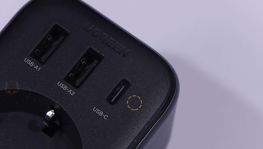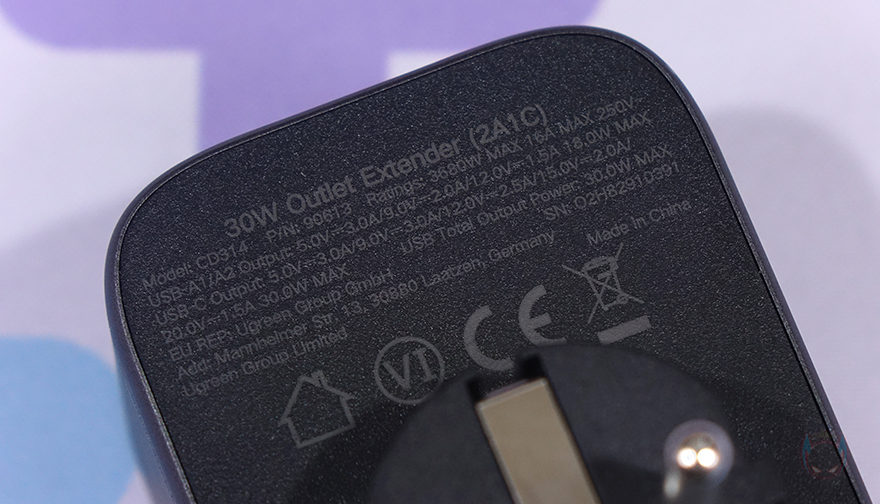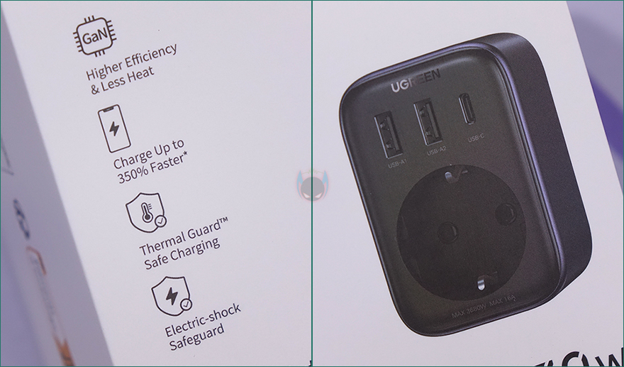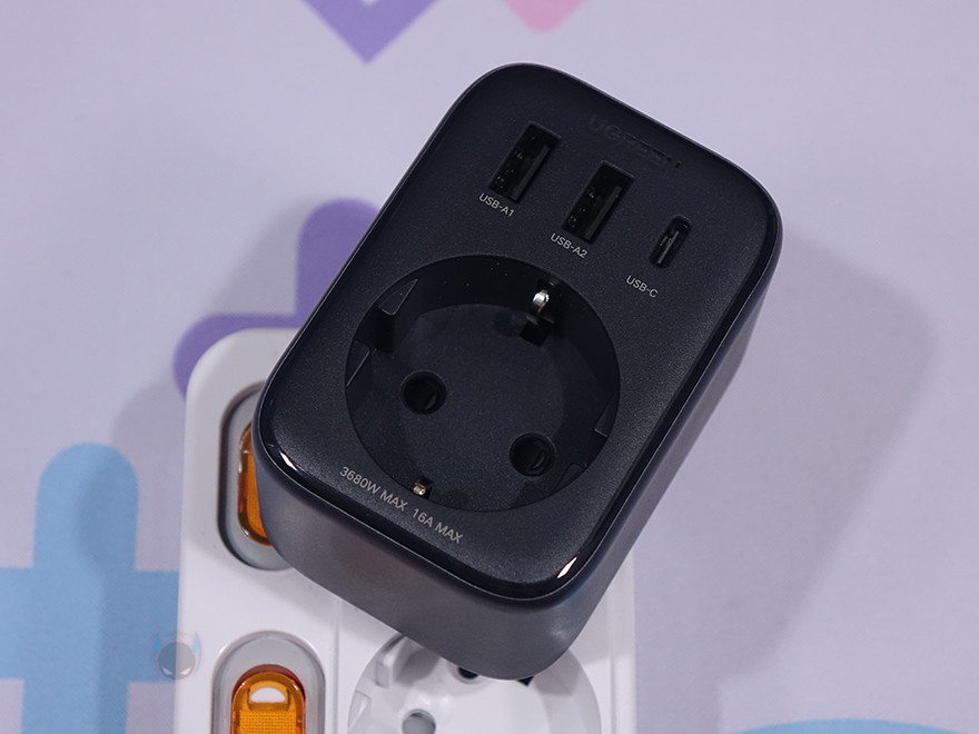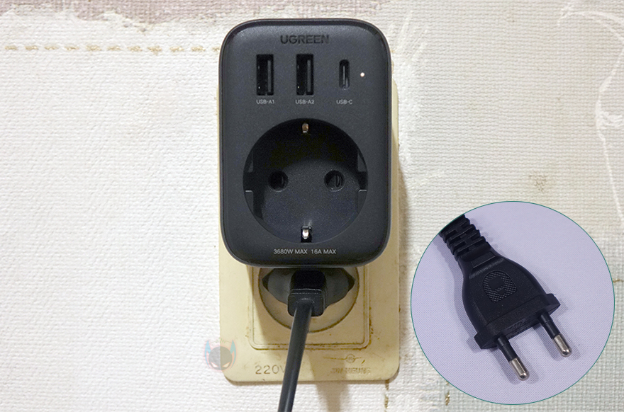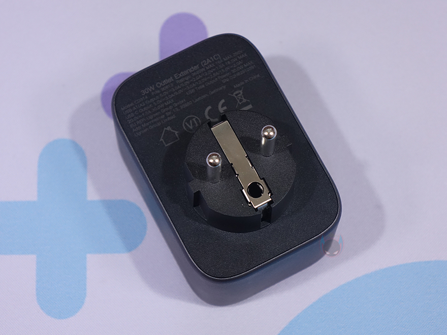 그리고, 측면에는 이런 콘센트를 갖추고 있다보니 일반적인 USB 어댑터보다는 두께가 좀 더 두꺼운데, 그래도 전체적인 사이즈가 큰 편이라 아니라서 휴대 시 부담은 되지 않고, 무게도 약 150g으로 무거운 편도 아니죠. 뿐만 아니라 앞서 언급했듯이 콘센트 최대 전력량이나 USB 고속 충전을 GaN(질화갈륨) 방식으로 하기 때문에 안전성에도 신경 써서 내부에는 과전압(OVP)/과전류(OCP)/과부하(OLP)/과열보호(OTP)/단락보호(SCP)가 적용되었으며, 내열성 보호도 갖추고 있습니다. 후면에는 벽-콘센트나 멀티탭에 연결할 수 있게 플러그가 적용되어 있는데, 유럽 기준의 EU 플러그 같은 경우에는 국내 플러그와 동일한 사이즈라 꽂았을 때 헐겁지도 않습니다. 그리고, 앞서 언급했던 각 USB 포트와 콘센트 전력량도 후면에 표시해 놔서 사용 전에 언제든지 참고할 수 있습니다.