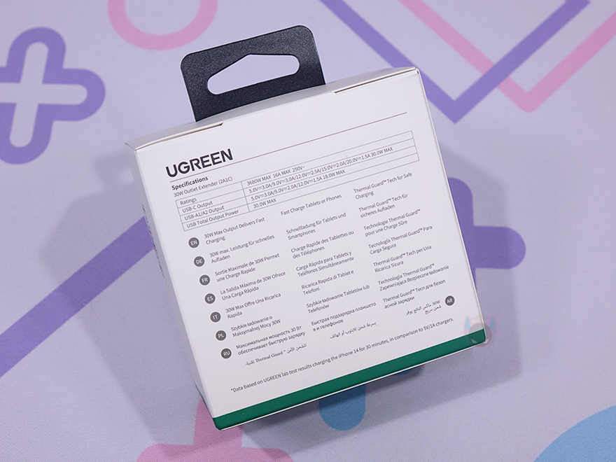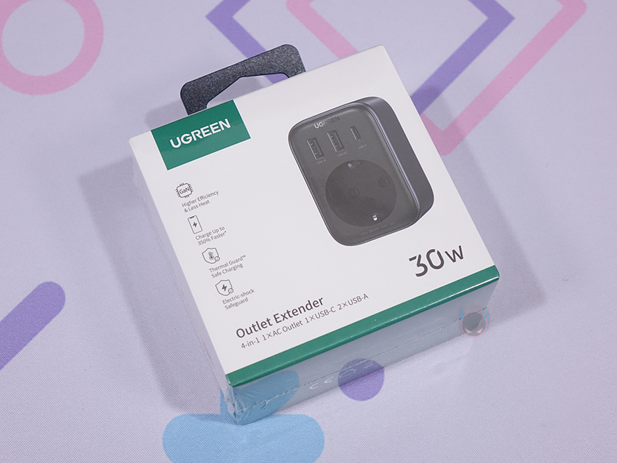 제품박스는 다른 유그린 제품들처럼 박스 전체가 비닐로 밀봉처리된 상태로 소비자입장에선 이런 포장까지 적용되어 있으면 아무래도 좀 더 판매제품에 신뢰가 가죠. 그리고, 박스 전면에 모델명과 함께 4-in-1 구성표기와 제품 이미지를 확인할 수 있는데, 앞전에 만났던 DigiNest 시리즈가 멀티탭 콘셉트의 제품이었다면, 이번 Outlet Extender은 이미지에서도 쉽게 알 수 있듯이 바로 콘센트에 꽂는 컨셉입니다. 물론, 바로 옆에 제품의 주요 특징에서 확인할 수 있듯이 USB 고속충전과 플러그 안전성을 위한 기술 적용도 확인할 수 있죠.
