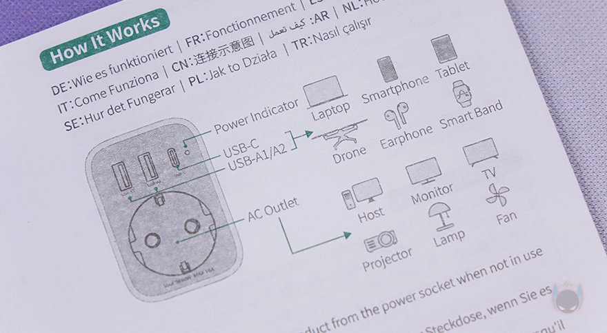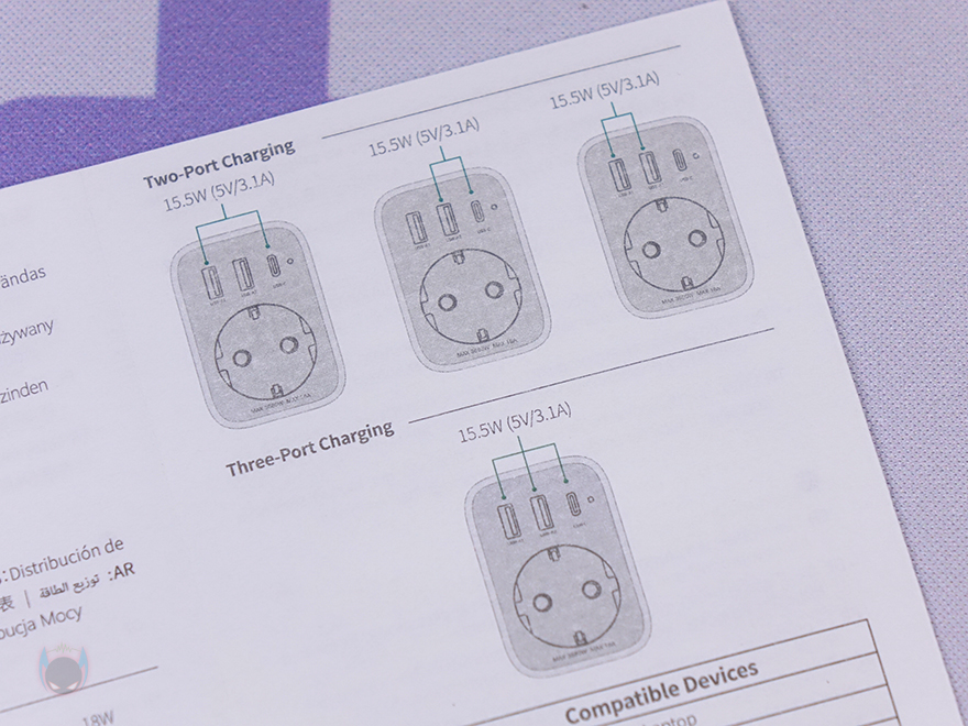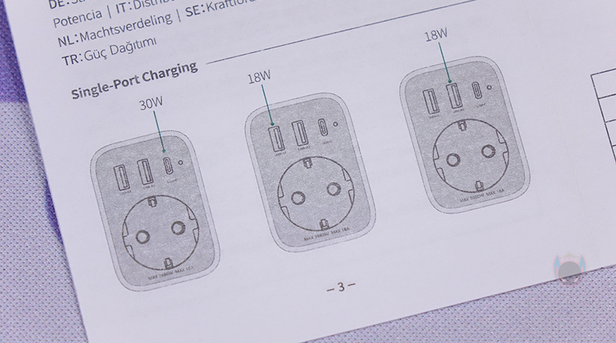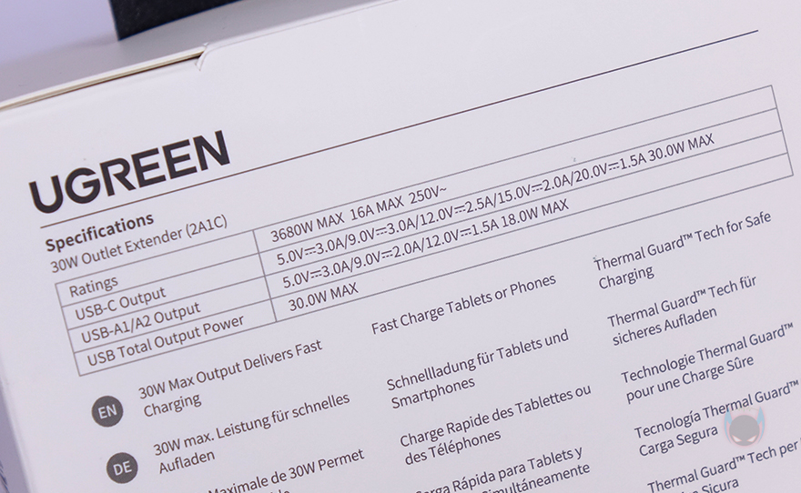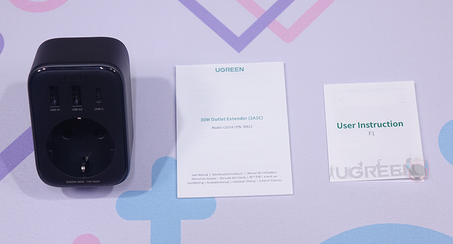 본격적으로 유그린(Ugreen) Outlet Extender 전원 스트립을 살펴보면, 한눈에 봐도 아담한 사이즈로 콘센트 1개와 USB 포트 3개로 구성된 4-in-1 제품입니다. 제품 설명서를 참고하면, 콘센트와 USB 포트가 각각 어떤 용도로 사용되는지 싶게 이해가 되죠. 먼저 콘센트 위에 배치된 3개의 USB 포트는 USB A타입 2개와 USB C타입 1개 구성으로, A타입은 전원/충전 사용 시 최대 18W를 지원하며, C타입은 전원/충전 사용 시 최대 30W를 지원합니다. 물론, 이건 1개만 사용했을 때 기준이고, 2개 이상부터 사용하면 3개의 포트 모두 최대 15W로 지원합니다. 그리고, 아래 콘센트에는 문구로도 표시해 놨듯이 최대 전력량이 3680W까지 지원하죠. 물론, 이런 제품에 냉장고나 스탠드 에어컨 같은 가전제품까지 연결해서 사용할 일은 없겠지만, 웬만한 가전제품들은 충분히 다 받쳐준다 할 수 있습니다. 국내에서 멀티탭 제품을 구입할 때 고급형을 구입해야 이 정도 전력량을 갖추고 있으니깐요.