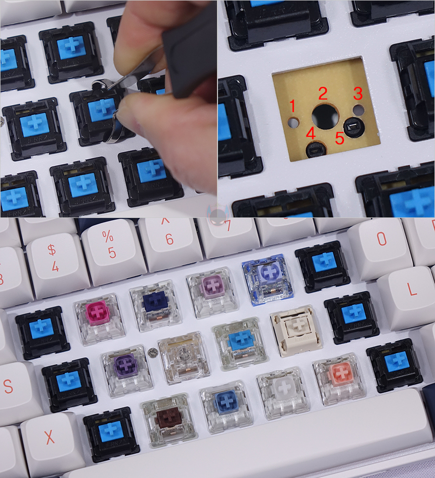 그리고, 스위치는 A100과 동일하게 A108에서도 JERRZI 스위치가 적용되었으며, 역시 청축과 황축 2가지로만 출시되었습니다. 또한, 스위치 분리가 가능한 핫-스왑(hot-swap) 방식 역시 그대로 유지하고 있는데, A100과 달리 A108에선 5pin 홈을 가지고 있어서 3pin과 5pin 스위치 모두 호환이 가능합니다. 또한, 스페이스-바 같은 키들의 스테빌라이저도 체리식으로 적용하고 있죠.