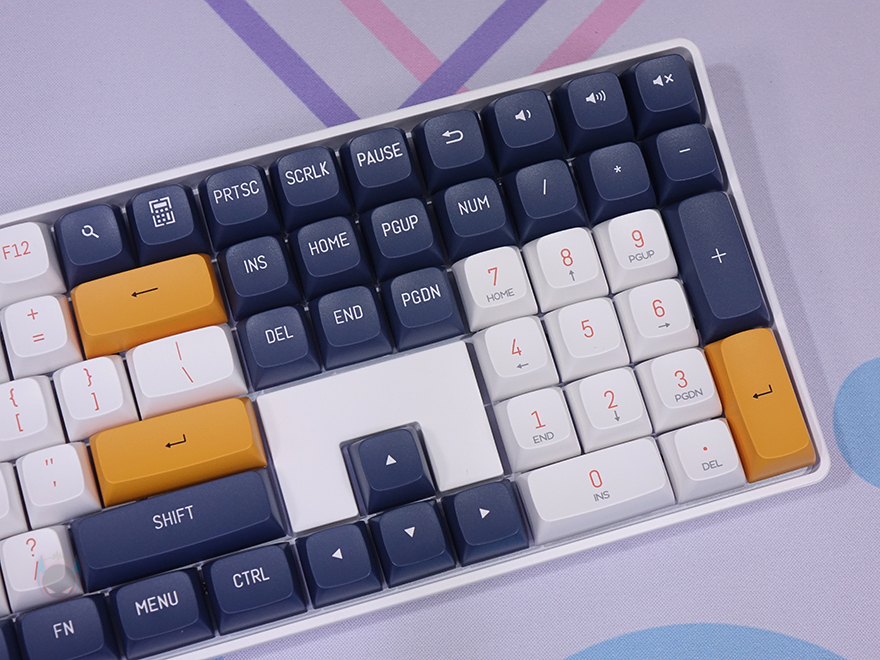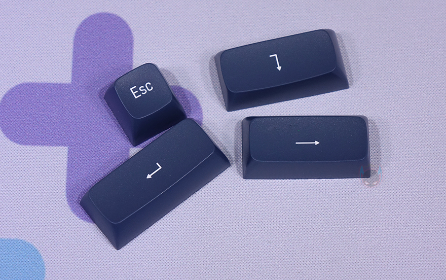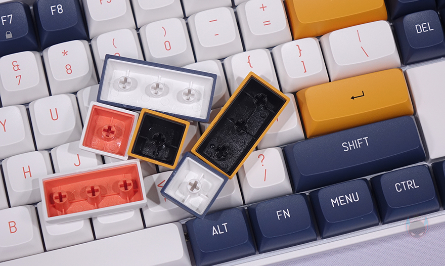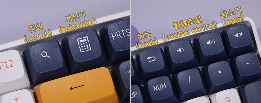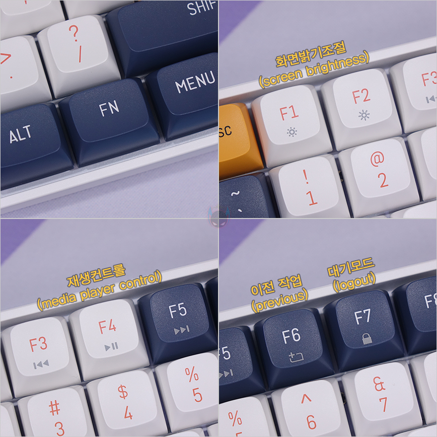 그리고, 새롭게 추가된 블루계열의 'Starry sky blue' 모델 같은경우에는 블루(blue)/엘로우(yellow)/화이트(white) 3가지 컬러로 키캡 색상을 적용하고 있는데, 추가로 제공해 주는 교체용 키캡을 사용하면 옐로우 대신에 블루로 교체되어 블루/화이트 투톤 컬러로도 맞출 수 있습니다. 물론, 키캡은 PBT 재질에 이중사출 방식이죠. 특히, 키캡 색상에 따라 폰트 색상도 다르기 때문에 지금까지 나온 색상 중에서는 소비자들이 가장 마음에 들어 하는 컬러 모델이 아닐까 생각합니다.