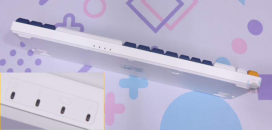 끝으로, A108 키보드의 하우징 케이스를 살펴보는데, 전면에는 왼쪽에 분리형 USB 전원 및 충전케이블과 연결되는 USB Type-C 포트가 배치되어 있으며, 스페이스-바 아랫쪽에는 Capslock, Numlock, 배터리 충전상태를 표시해 주는 LED 인디케이터가 배치되어 있습니다. 그리고, 키보드 측면에서 보면 타이핑에 최적화라 불리는 스텝-스컬처 2 단계배열을 갖추고 있죠. 또한, 키보드 밑바닥에는 A100과 동일하게 한쪽에 무선 On/Off 스위치가 배치되어 있으며, 모서리 부근과 높낮이 받침대에는 미끄럼방지 패드가 부착되어 있으며, 높낮이 받침대도 2 단계로 동일합니다. 물론, 왼쪽 받침대에 무선 2.4GHz 사용 시 이용되는 동글이 수납도 동일한 위치죠. 그리고, 유선과 충전 시 사용되는 분리형 USB 케이블은 총 1.5m 길이에 신호손실을 줄이도록 노이즈 필터가 적용되었으며, 인터페이스는 USB Type-C to A로 적용되어 있습니다.