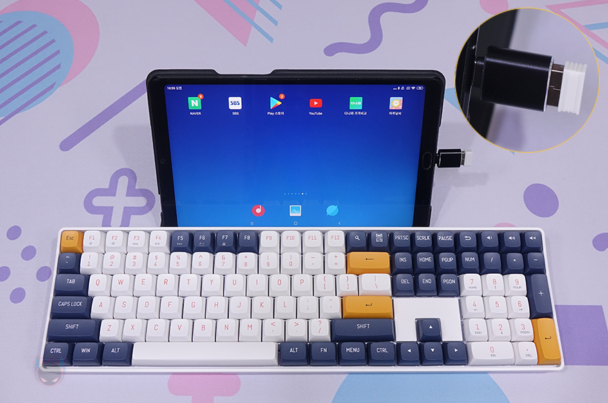 직접, Aigo A108 유무선 기계식 키보드를 사용해보면, 연결방식은 A100과 동일하기 때문에 유선 사용 시에는 분리형 USB 케이블을 사용하면 되고, 무선 사용 시에는 제공되는 동글이를 PC에 꽂으면 인식과 동시에 바로 연결되어서 사용하면 됩니다. 물론, 무선 On/Off 스위치를 켜야 하겠죠. 또한, 무선 같은 경우에는 스마트폰이나 태블릿 PC에서 사용하고 싶다면 OTG 같은 젠더를 사용해 연결하면 사용이 가능하고, 부가 기능도 그대로 사용할 수 있죠.