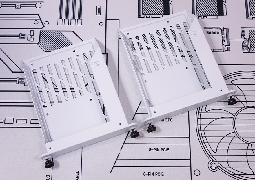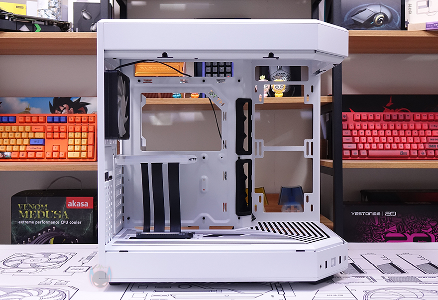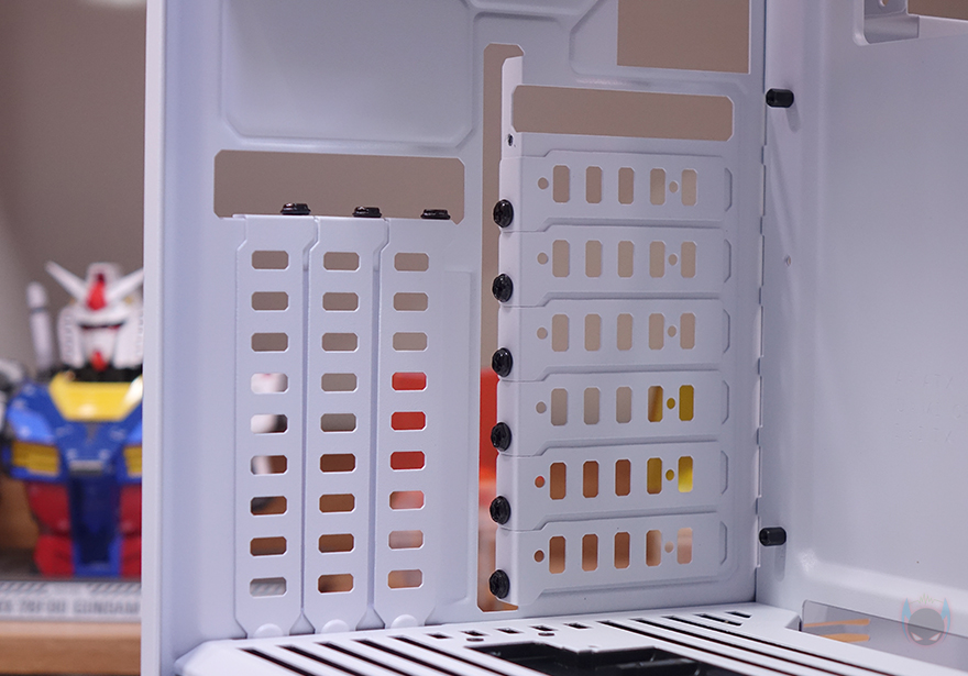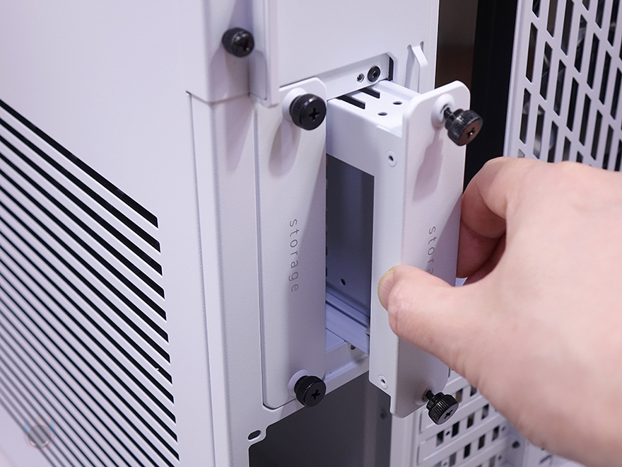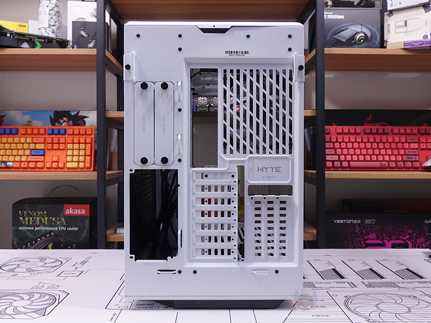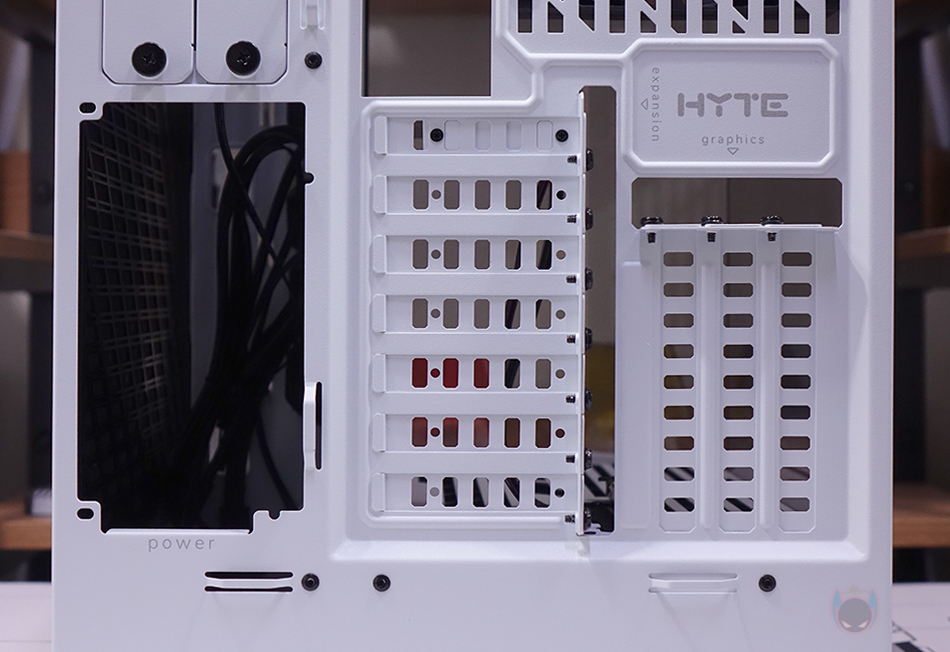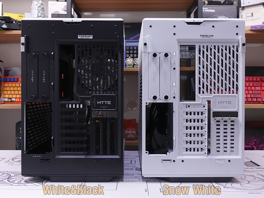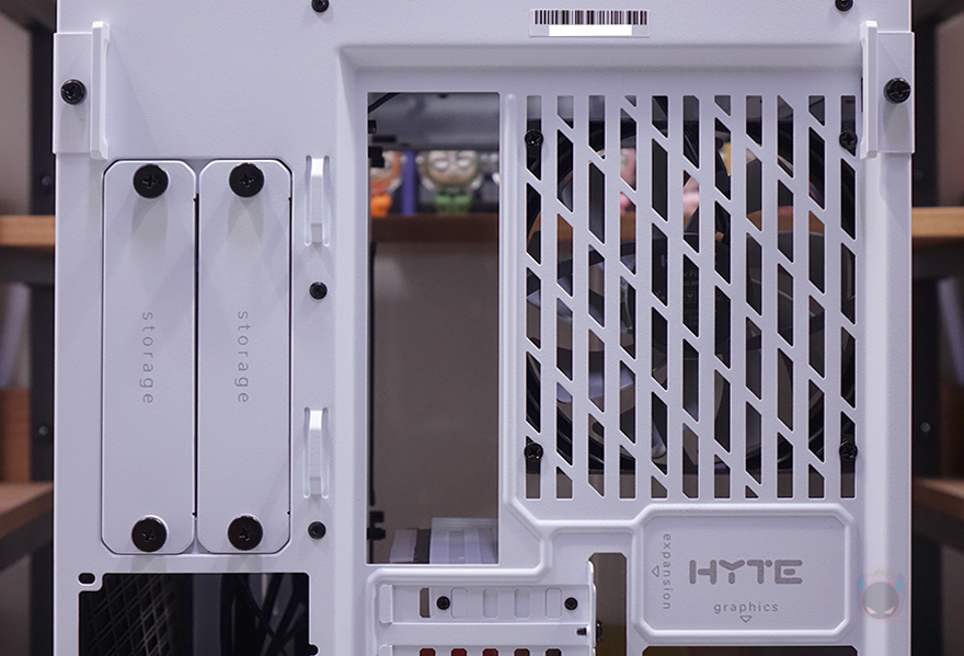 Y60 Snow White 케이스 후면을 보면, 역시 후면도 화이트 색상으로 적용된 것을 확인할 수 있는데, 기존 화이트 모델인 White&Black과 비교하면 쉽게 이해가 되죠. 그리고, Y60은 큐브형 케이스 구조 그러니깐 파워서플라이 메인보드 트레이 후면에 장착되는 구조라 케이스 폭이 넓습니다. 그래서, 후면 윗부분에는 왼쪽에 후면 배기역할의 에어홀 처리와 함께 내부에 120mm 팬이 기본 장착된 것을 간접적으로 먼저 확인할 수 있으며, 오른쪽에는 저장장치를 장착할 수 있는 브라켓이 적용되어 있죠. 또한, 후면 아랫부분에는 PCI슬롯과 파워서플라이 자리로 PCI 슬롯은 Y60의 특징 중 하나인 수직 그래픽카드(VGA) 장착을 지원하기 때문에, 수평으로 짧은 PCI 슬롯, 기본 길이의 PCI 슬롯은 수직으로 3개 적용되어 있습니다. 그리고, 저장장치 브래킷 역시 Snow White 콘셉트에 맞춰 화이트 색상으로 변경되었고, 2개의 브래킷에는 3.5인치 HDD일 경우 2개, 2.5인치 HDD/SSD일 경우 최대 4개를 장착할 수 있죠.
