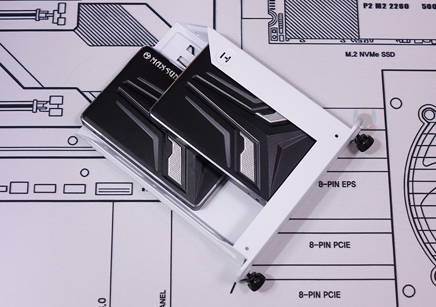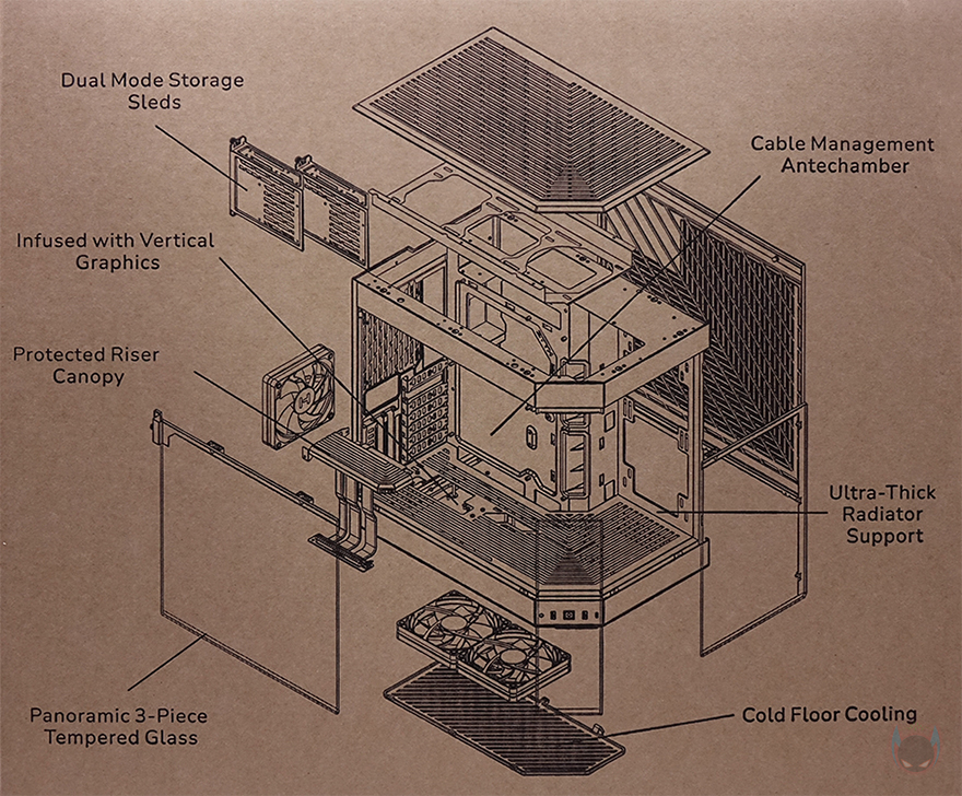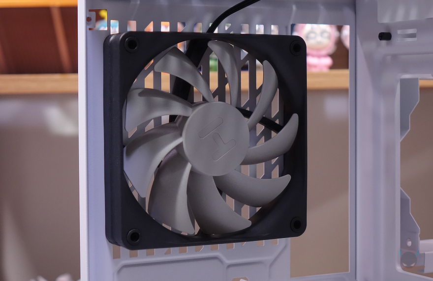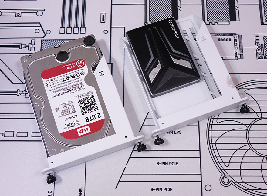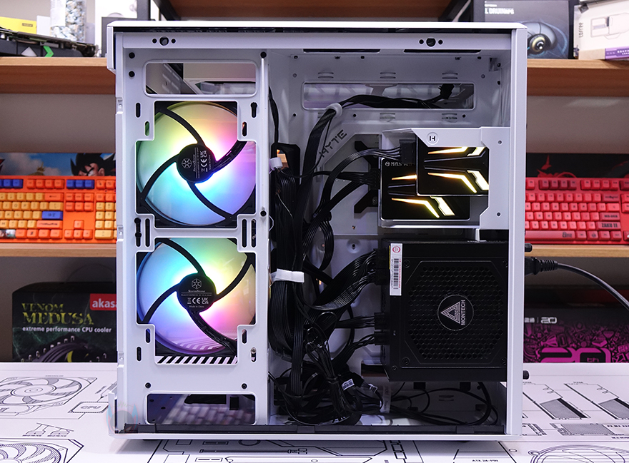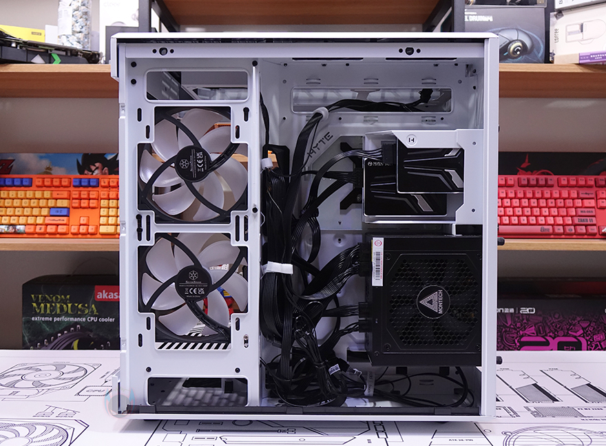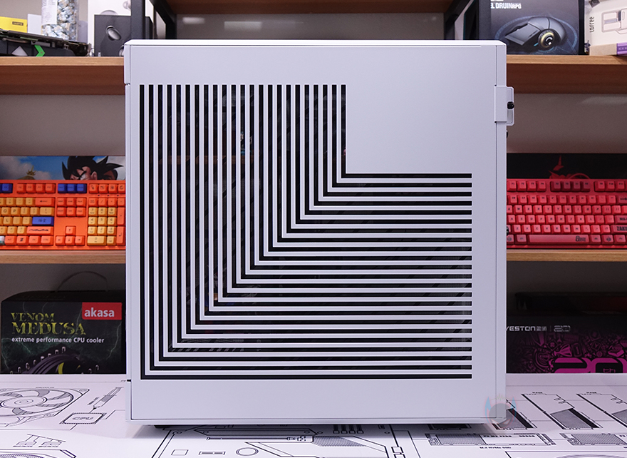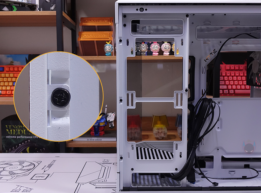 Y60 Snow White 케이스 후면을 보면, 역시 후면도 화이트 색상으로 적용된 것을 확인할 수 있는데, 기존 화이트 모델인 White&Black과 비교하면 쉽게 이해가 되죠. 그리고, Y60은 큐브형 케이스 구조 그러니깐 파워서플라이 메인보드 트레이 후면에 장착되는 구조라 케이스 폭이 넓습니다. 그래서, 후면 윗부분에는 왼쪽에 후면 배기역할의 에어홀 처리와 함께 내부에 120mm 팬이 기본 장착된 것을 간접적으로 먼저 확인할 수 있으며, 오른쪽에는 저장장치를 장착할 수 있는 브라켓이 적용되어 있죠. 또한, 후면 아랫부분에는 PCI슬롯과 파워서플라이 자리로 PCI 슬롯은 Y60의 특징 중 하나인 수직 그래픽카드(VGA) 장착을 지원하기 때문에, 수평으로 짧은 PCI 슬롯, 기본 길이의 PCI 슬롯은 수직으로 3개 적용되어 있습니다. 그리고, 저장장치 브래킷 역시 Snow White 콘셉트에 맞춰 화이트 색상으로 변경되었고, 2개의 브래킷에는 3.5인치 HDD일 경우 2개, 2.5인치 HDD/SSD일 경우 최대 4개를 장착할 수 있죠.