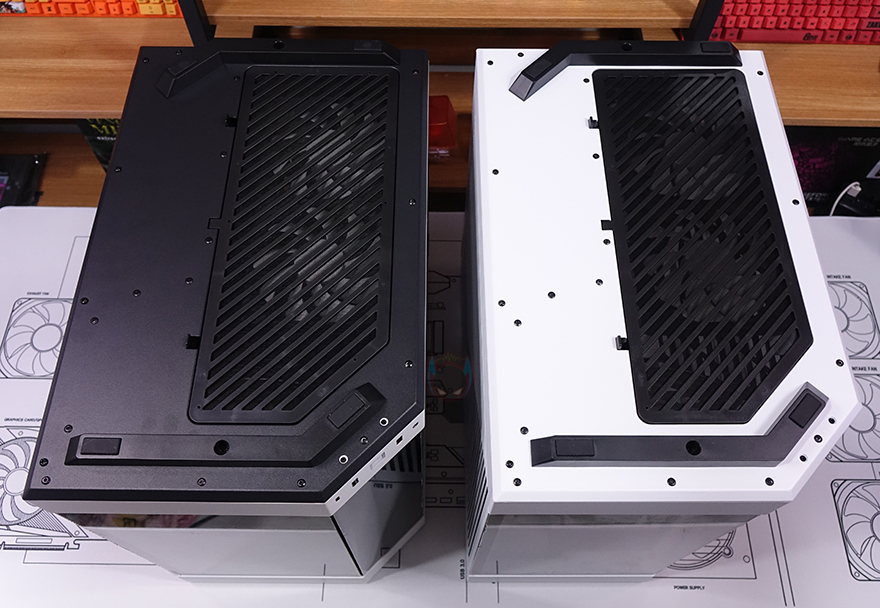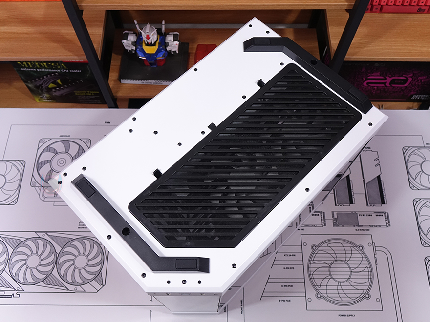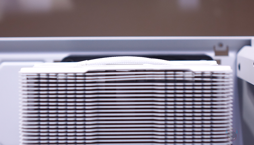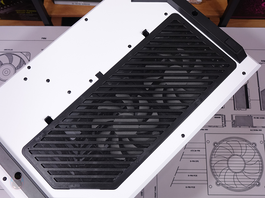 케이스 상단 베젤 역시 에어홀 처리는 먼저 나왔던 다른 색상의 모델들과 동일하게 라인형태의 에어홀 디자인을 적용하고 있는데, 상단 베젤을 분리해보면 앞서 언급한 내부 화이트로 적용된 위치 중 내부 상단의 화이트 색상을 가장 먼저 확인할 수 있죠. 또한, 다른 색상 모델에선 볼 수 없었던 또 한 가지를 확인할 수 있는데, 바로 3면 강화유리 패널의 라인을 따라 스펀지를 부착해 놨습니다. 직접적으로 강화유리에 접촉하는 것은 아니지만, 아무래도 상단 베젤이 볼-핀 방식으로 장착되기 때문에 장착 시 충격전달을 감소하기 위해서 새롭게 적용한 거라 볼 수 있죠. 그리고, 상단 베젤 안쪽에는 역시 동일하게 먼지 필터가 기본 적용되어 있으며, 상단 쿨링시스템을 갖출 수 있는 팬/라디에이터 브래킷도 Snow White 콘셉트에 맞춰 화이트 색상으로 변경되었고, 지원은 동일하게 팬은 120mm 최대 3개, 140mm 최대 2개, 수랭쿨러시 라디에이터 360mm까지 장착할 수 있습니다.