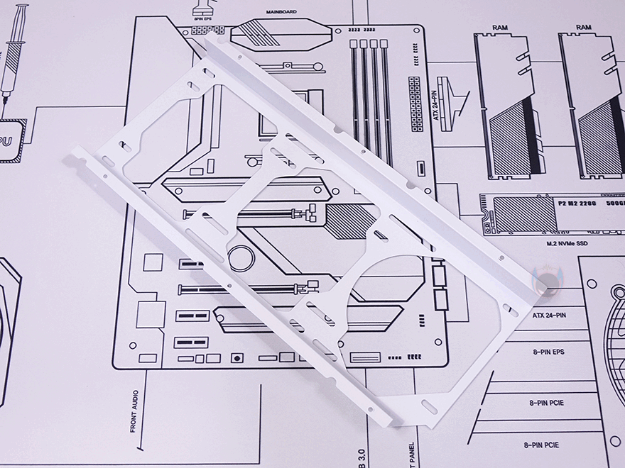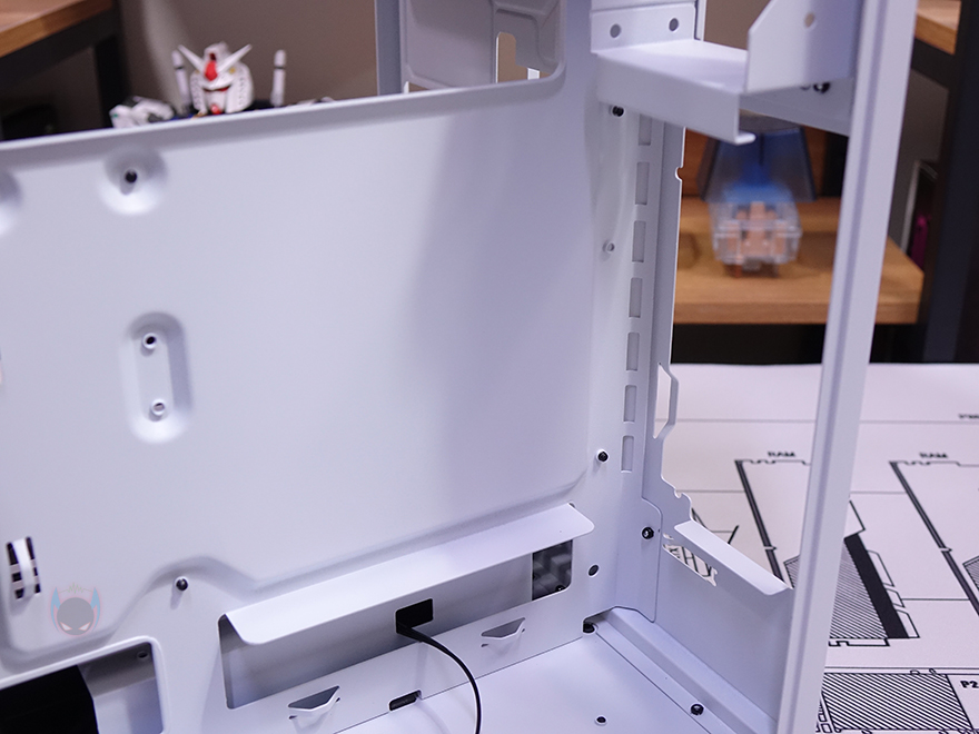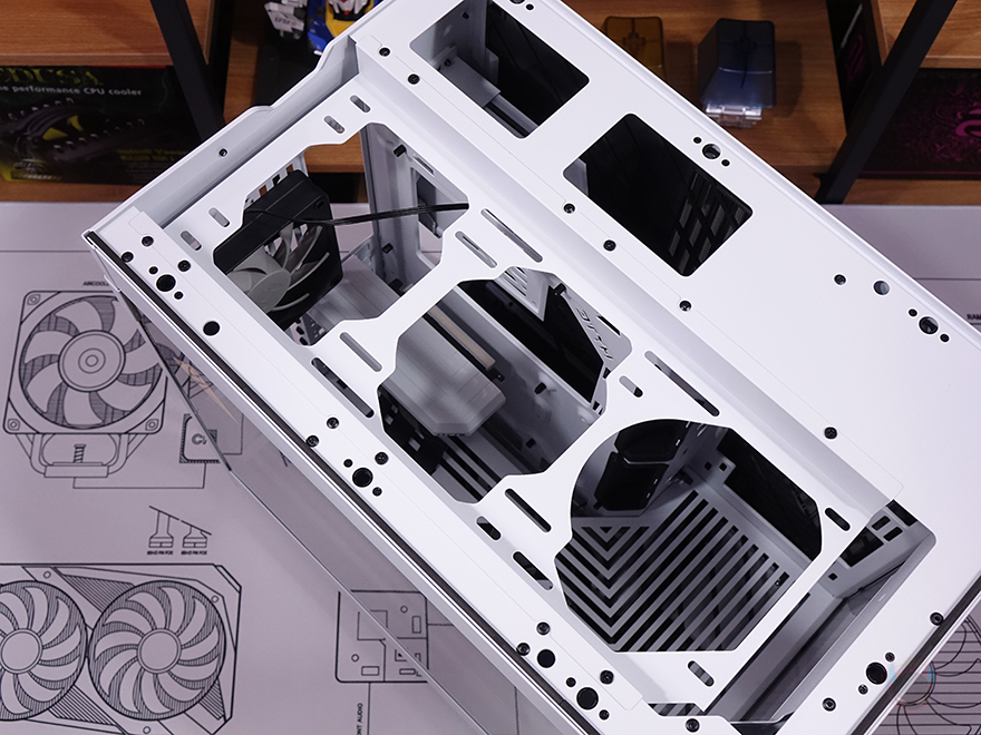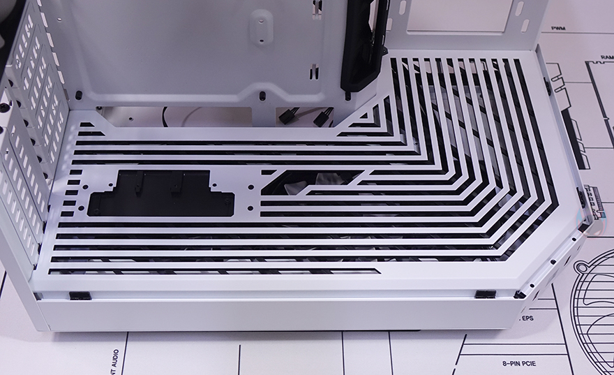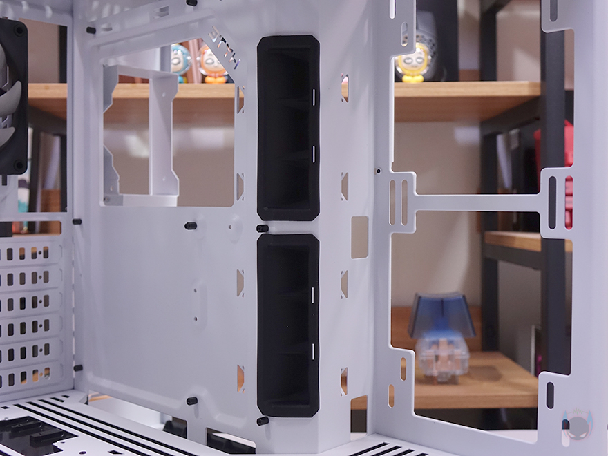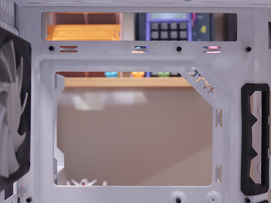 메인보드가 장착되는 트레이(Tray)를 살펴보면, CPU 쿨러 교체에 편의성을 위해 CPU-cut-Out 처리가 되어 있으며, 트레이 주변 그러니깐 상하/앞방향으로는 케이블 정리를 위한 선정리-홀이 처리되어 있습니다. 특히, 내부 하단 같은경우에는 앞서 외부에서 확인했듯이 기본적으로 하단 쿨링시스템을 갖추고 있기 때문에 하단 쿨링효과를 위해 상단 베젤과 동일한 라인형태의 에어홀 처리를 해놨으며, 역시 화이트색상으로 통일시켰죠. 그리고, 내부 앞자리에는 전면에 강화유리 패널이 적용되기 때문에 측면에서 쿨링효과를 볼 수 있도록 팬 혹은 수랭쿨러시 라디에이터를 장착할 수 있게 지원하는데, 팬 경우 120/140mm 2개, 라디에이터는 280mm까지 장착할 수 있습니다.
