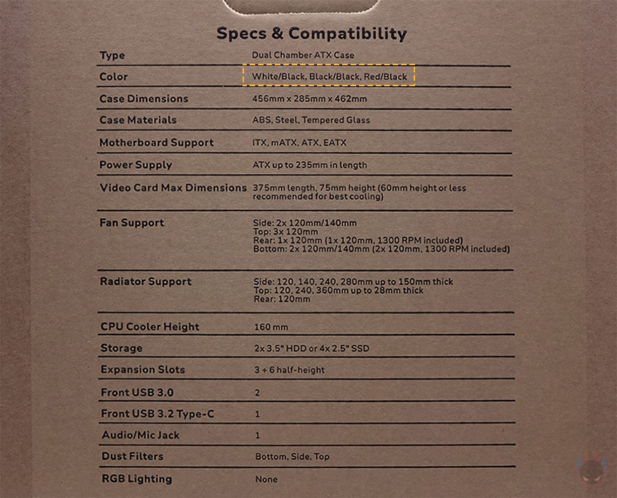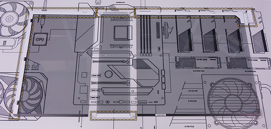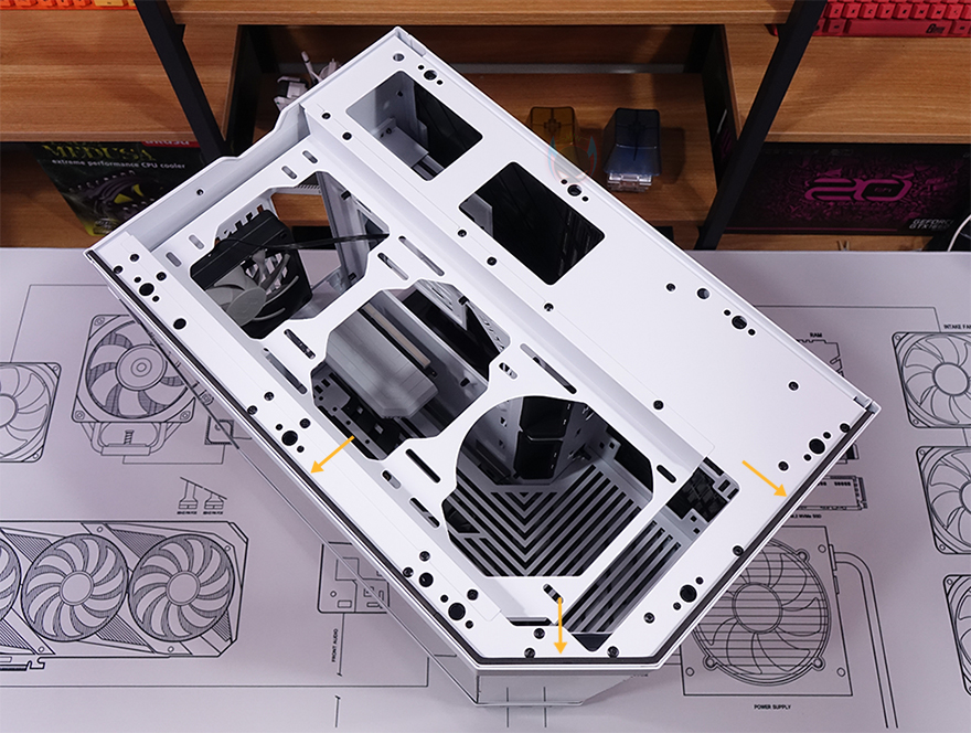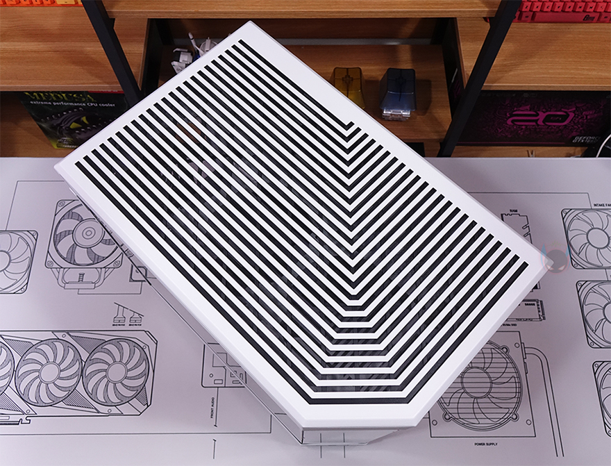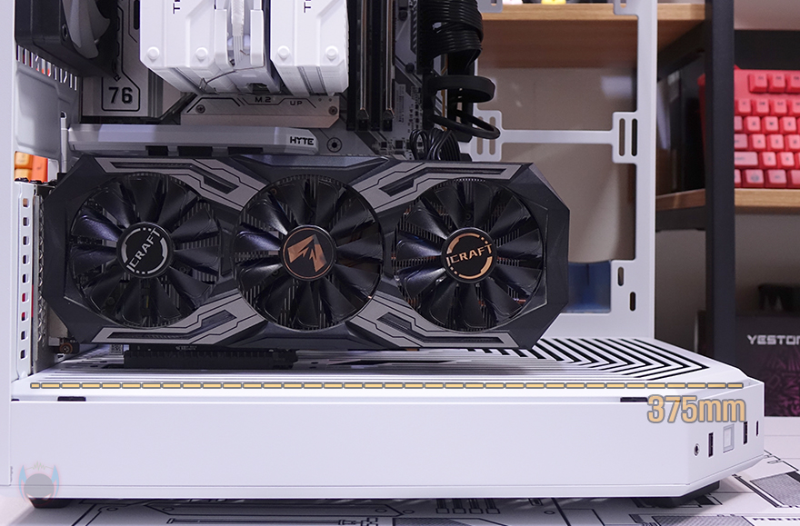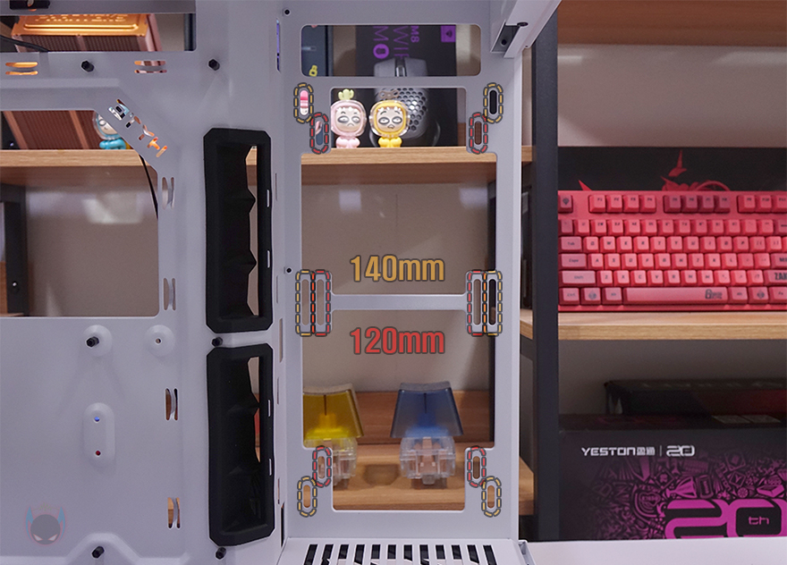 메인보드가 장착되는 트레이(Tray)를 살펴보면, CPU 쿨러 교체에 편의성을 위해 CPU-cut-Out 처리가 되어 있으며, 트레이 주변 그러니깐 상하/앞방향으로는 케이블 정리를 위한 선정리-홀이 처리되어 있습니다. 특히, 내부 하단 같은경우에는 앞서 외부에서 확인했듯이 기본적으로 하단 쿨링시스템을 갖추고 있기 때문에 하단 쿨링효과를 위해 상단 베젤과 동일한 라인형태의 에어홀 처리를 해놨으며, 역시 화이트색상으로 통일시켰죠. 그리고, 내부 앞자리에는 전면에 강화유리 패널이 적용되기 때문에 측면에서 쿨링효과를 볼 수 있도록 팬 혹은 수랭쿨러시 라디에이터를 장착할 수 있게 지원하는데, 팬 경우 120/140mm 2개, 라디에이터는 280mm까지 장착할 수 있습니다.