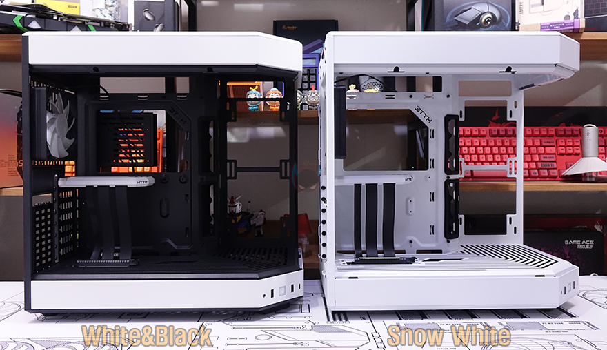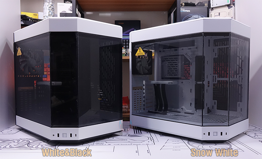 그럼, 본격적으로 HYTE(하이트) Y60 Snow White PC케이스를 살펴보는데, 앞서 언급했듯이 Y60을 이미 알고 있는 소비자라면 Y60 Snow White에서 무엇이 달라졌는지 쉽게 알아볼 수 있습니다. 뒤에서 내부를 살펴볼 때 다시 확인하겠지만, Snow White 색상은 외부뿐만 아니라 내부까지 화이트색상이 적용된 거죠. 1년 전에 먼저 나왔던 화이트 모델 정확히는 White&Black 모델과 함께 놓고 비교해 보면 더 쉽게 이해할 수 있습니다. 물론, 내부뿐만 아니라 외부에서 색상이 바뀐 부분이 있는데 이것도 뒤에서 다시 확인하겠습니다.