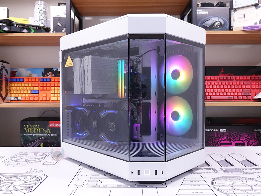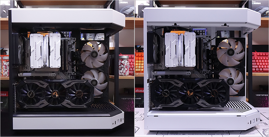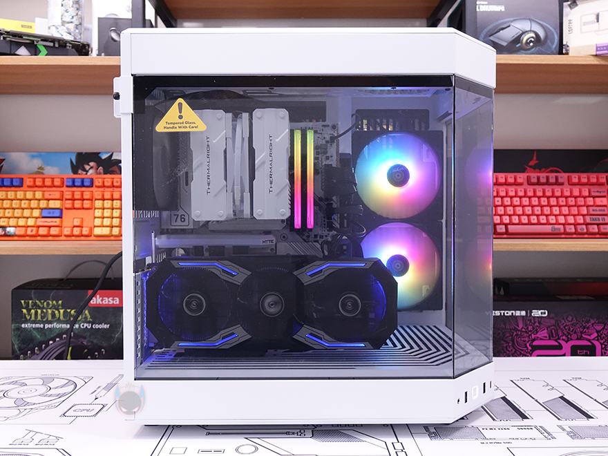 직접, HYTE Y60 Snow White PC케이스를 사용해 시스템 조립을 해보면, 색상만 추가된 모델이라 조립 환경을 먼저 나왔던 다른 색상의 모델과 동일합니다. 일단, CPU 쿨러경우 타워형 쿨러 기준으로 최대 높이 160mm까지 지원하기때문에, 시중에 판매되는 일부 듀얼-타워 쿨러를 제외하면 대부분이 장착이 가능하며, 그래픽카드(VGA) 경우에는 최대 375mm 길이까지 지원하기 때문에 길이로써는 사실상 간섭이 없다고 볼 수 있지만, Y60 특성상 수직방향으로만 장착이 가능하기 때문에, 3단 슬롯 높이 정확히는 최대 75mm를 초과하면 안 됩니다. 이외에 저장장치와 파워서플라이는 후면 공간을 따로 차지하는 만큼 조립에 어려움이 없으며, 케이블 정리 역시 후면 공간이 널찍한만큼 초보자도 쉽게 정리할 수 있습니다. 다만, 후면에 장착되기때문에, 저장장치나 파워서플라이에 RGB 라이트닝 효과가 있다면 가려지겠죠. 조립 후, 전원을 켜보면, 측면 측면 쿨링시스템에 RGB 팬을 적용하거나 부품 중에 RGB 라이트닝 효과가 있다면 기존 화이트 모델보다 좀 더 밝은 느낌으로 외부에서 Y60 특유의 3면 글라스 패널을 통해 어느 방향도 시각 효과를 누릴 수 있겠습니다.