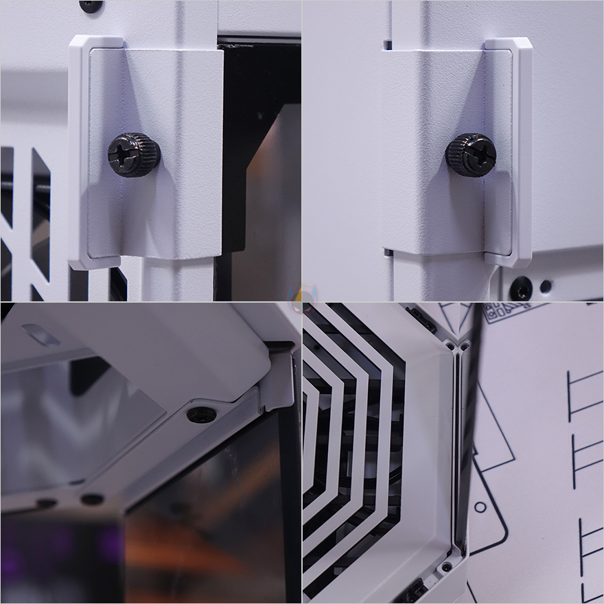 이제 HYTE(하이트) Y60 Snow White PC케이스의 내부를 살펴보는데, 강화 유리 패널과 우측 패널 분리 모두 먼저 나왔던 다른 색상의 모델들과 동일하게 고정된 나사들을 풀면 쉽게 분리가 됩니다. 좌측 강화유리 패널과 우측 패널은 후면 손나사를 풀면 되고, 전면 강화유리 패널은 측면에 고정 나사 3개, 중간 강화유리 패널은 안쪽 위아래 나사를 풀면 되죠. 그리고, 분리된 강화유리 패널 안쪽을 보면 역시 Snow White 콘셉트에 따라 보강샤시 부분이 화이트로 처리된 것을 확인할 수 있습니다.