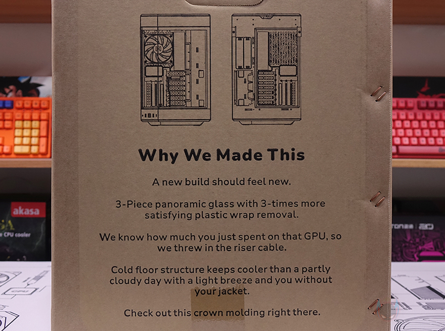 HYTE Y60 Snow White는 기존 Y60에 새로운 색상만 추가된 모델이라 제품 패키지는 먼저 나왔던 다른 색상의 모델 패키지와 동일합니다. 물론, 박스 전면에 부착되는 색상구분의 스티커는 해당 색상에 맞춰서 제품 이미지와 색상표기를 해놨는데, 이미 Y60 PC케이스를 알고 있는 소비자라면 쉽게 무엇이 달라졌는지 알아볼 수 있습니다. 그리고, 역시 모델명과 함께 주요 특징 3가지 표기도 그대로 사용했으며, 박스 후면에 Y60 PC케이스 구조 이미지도 그대로 담고 있죠. 박스 측면에 그대로 한쪽에는 Y60을 만든 이유와 반대쪽에는 제품의 기본 사양을 표기하고 있는데, 박스 패키지를 그대로 사용했기 때문에, 사양표기에 색상 구분 표기에는 아직 Snow White라는 표기가 없습니다. 물론, 리뷰에 사용된 제품이 샘플이라 아직 적용되지 않았다고 볼 수 있기 때문에, 추후 판매제품에는 색상표기도 적용될 수 있습니다.