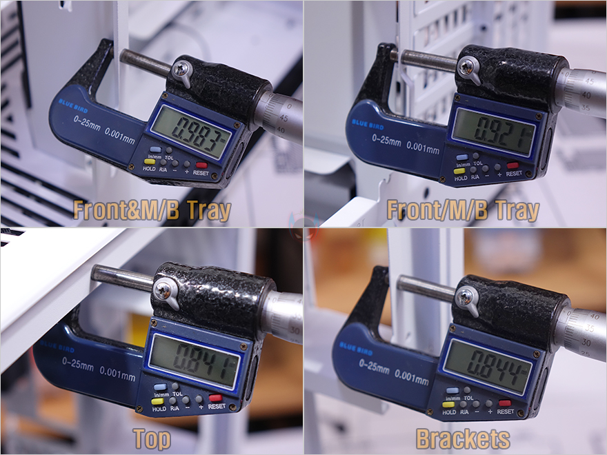 내부 후면에는 외부에서 간접적으로 확인했던 후면 배기 역할의 120mm 팬을 확인할 수 있으며, 아래 PCI슬롯 가이드는 수평/수직 가이드 모두 재사용이 가능한 탈착형으로 적용되어 있습니다. 메인보드 트레이 후면 공간 그러니깐 저장장치와 파워서플라이가 장착되는 후면 공간에는 파워서플라이 장착을 위해 받침대가 적용되어 있으며, 큐브형 케이스 구조를 가졌기때문에 케이블 정리를 위한 후면 공간은 약 90mm로 매우 충분하죠. 끝으로, Y60 Snow White에 사용된 샤시의 두께를 부위별로 측정해 보면, 약 0.8~0.9mm 대로 도색 부분을 감안하면 0.8T 샤시가 사용되었음을 짐작할 수 있습니다.