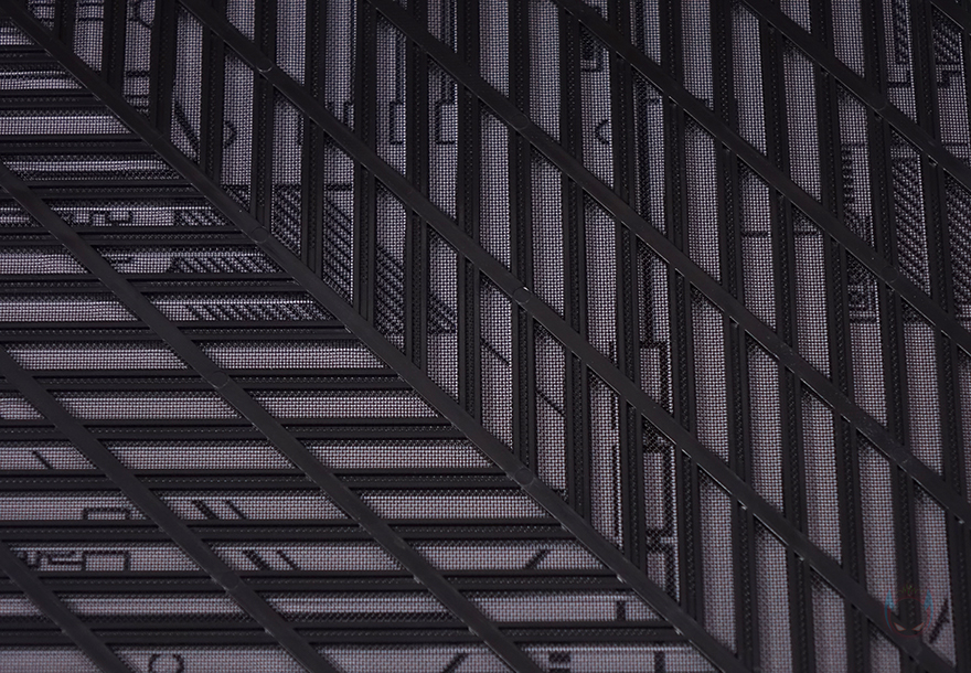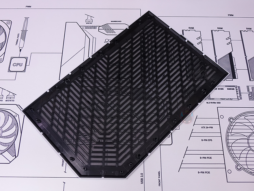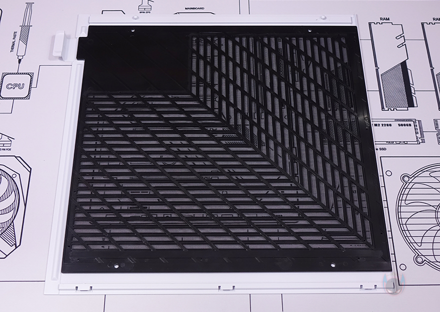 유일하게 강화유리 패널이 적용되지 않는 오른쪽 패널(전면시 기준) 역시 상단 패널과 동일한 라인형태의 에어홀 디자인을 적용하고 있으며, 패널은 분리해서 안쪽을 보면 역시 기본 먼지 필터가 적용된 것을 확인할 수 있습니다.