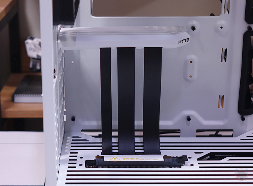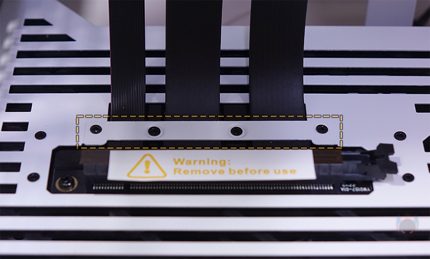 패널을 모두 분리한 상태에서 내부를 보면 앞서 외부에서 보던 것보다 올-화이트(All-White) 감성이 더 다가오는데, 먼저 나왔던 화이트(White&Black) 모델과 비교해보면 그 차이를 더 실감할 수 있죠. 색상만 추가된 모델이기 때문에 내부 구조는 동일합니다. 일단, Y60의 특징 중 하나인 수직방향 그래픽카드(VGA) 장착을 위해 PCIe 라이저(Riser) 카드가 기본 제공됩니다. 라이저 카드 색상은 기존 화이트 모델에서도 사용되던 거라 그대로 동일하고, 신경 써서 보면 그래픽카드가 장착되는 아래 위치한 PCIe 슬롯 고정대도 화이트 맞춘 걸 확인할 수 있죠. 그리고, 역시 고정된 나사들을 풀면 분리도 가능하고, 개봉 시에는 메인보드와 연결되는 슬롯에는 커버가, 그래픽카드가 장착되는 슬롯-홈에는 보호비닐이 부착되어 있습니다.