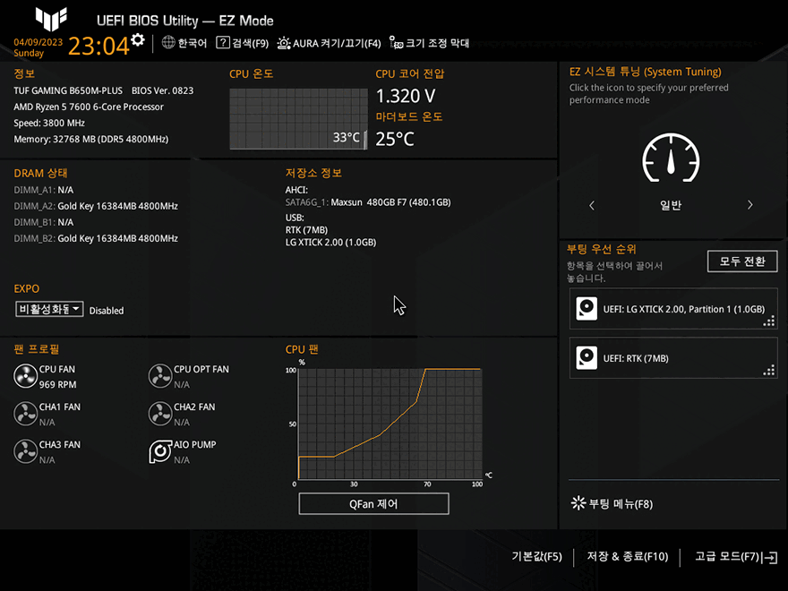 그럼, 직접 ASUS TUF Gaming B650M-Plus 메인보드로 시스템 조립을 해서 사용해봤습니다. 일단, 바이오스 CMOS 메뉴부터 살펴보면, 기존의 TUF Gaming 메인보드가 가지고 있던 UEFI 인터페이스와 동일하기때문에 한 번이라도 TUF Gaming 라인업의 메인보드를 사용했다면 익숙합니다. 그리고, 메뉴도 기존의 ASUS 메인보드들과 동일하죠. F7키를 통해서 EZ Mode와 Advanced Mode로 서로 전환할 수 있으며, Advanced Mode에선 기본/Ai Tweaker/고급/모니터/부팅/도구/나가기 메뉴를 확인할 수 있죠.
