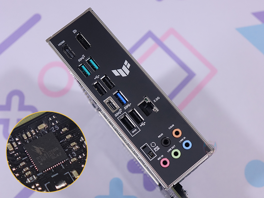 그리고, PCIe 슬롯 오른쪽에 배치된 메인보드 메인칩셋 방열판 자리 아래에도 추가 5V ARGB와 12V RGB 헤더가 배치되어 있으며, 왼쪽으로 역시 S-ATA 커넥터 1개가 배치되어 총 4개의 S-ATA 구성을 하고 있죠. 또한, PCIe 슬롯 맨 왼쪽에는 내장 오디오 부분으로 독립 PCB구간으로 처리했으며, 일본산 콘덴서를 비롯해 오디오 칩셋은 리얼텍사 제품을 사용했습니다. 끝으로, 백패널 I/O 포트 같은 경우에는 모니터 출력의 DP와 HDMI 포트를 비롯해, USB 3.2 Gen2 포트(녹색) 2개, USB 2.0 포트 4개, USB 3.2 Gen1 포트(블루) 1개, USB 3.2 Gen 2x2 Type-C 포트 1개, 2.5Gbps 랜포트, 오디오포트, 그리고, BIOS Flashback 버튼까지 적용되어 있습니다. 참고로, 랜 칩셋 역시 리얼텍사입니다.