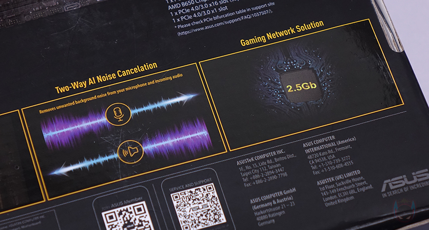 제품박스부터 살펴보면, 전면에는 모델명과 함께 제품 이미지 그리고 국내 정식 수입사인 STCOM의 3년 무상보증 스티커를 확인할 수 있습니다. 물론, 모델명 아래에는 AMD의 최신 라이젠 7000 시리즈 지원 표기부터 PCIe 5.0 M.2 SSD, DDR5 메모리, dts, ASUS RGB Sync인 AURA Sync 지원 등의 표기도 확인할 수 있죠. 그리고, 박스 후면에는 제품 풀-샷 이미지와 함께 제품의 기본 사양을 상세하게 표기해놓고 있는데, 오른쪽에는 CPU, 칩셋, 메모리, 저장장치, PCIe 슬롯 지원을, 왼쪽에는 백패널의 I/O 포트 구성 및 지원, 그리고 내부 헤더 지원을 표기해 놨습니다. 물론, 아래에는 방금 언급했던 지원 중 일부를 주요 특징으로도 표기해 놨죠.