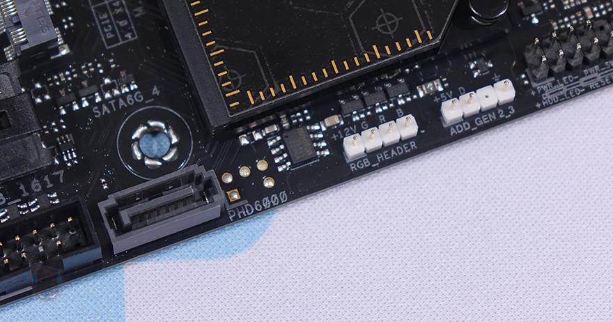 PCIe 슬롯은 총 3개를 갖추고 있으며, 1번 슬롯 위아래로는 M.2 SSD 슬롯이 배치되어 있는데, 2개의 슬롯 모두 발열해결을 할 수 있게 방열판이 장착되어 있으며, 방열판 안쪽에는 써멀패드도 기본 부착되어 있죠. 그래픽카드가 장착되는 PCIe 1번 슬롯은 내구성 강화를 위해 금속 커버를 적용한 세이프슬롯 고어+ 기술을 적용해 놨으며, PCIe 1번 슬롯 위에 배치된 M.2 SSD 슬롯 1번은 PCIe 5.0x4레인까지 지원하는 최신 규격으로 2280 길이까지 장착할 수 있고, 무나사 방식의 Q-랜치를 적용하고 있습니다. 물론, PCIe 1번 슬롯 아래 배치된 M.2 SSD 슬롯 2번도 2280 길이까지 장착할 수 있는데, 규격은 PCIe 4.0x4레인까지 지원합니다.