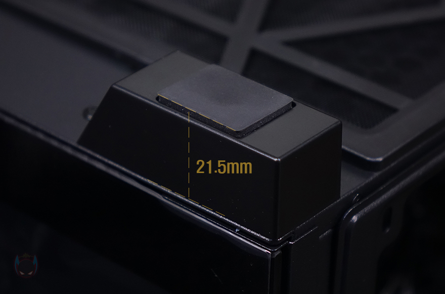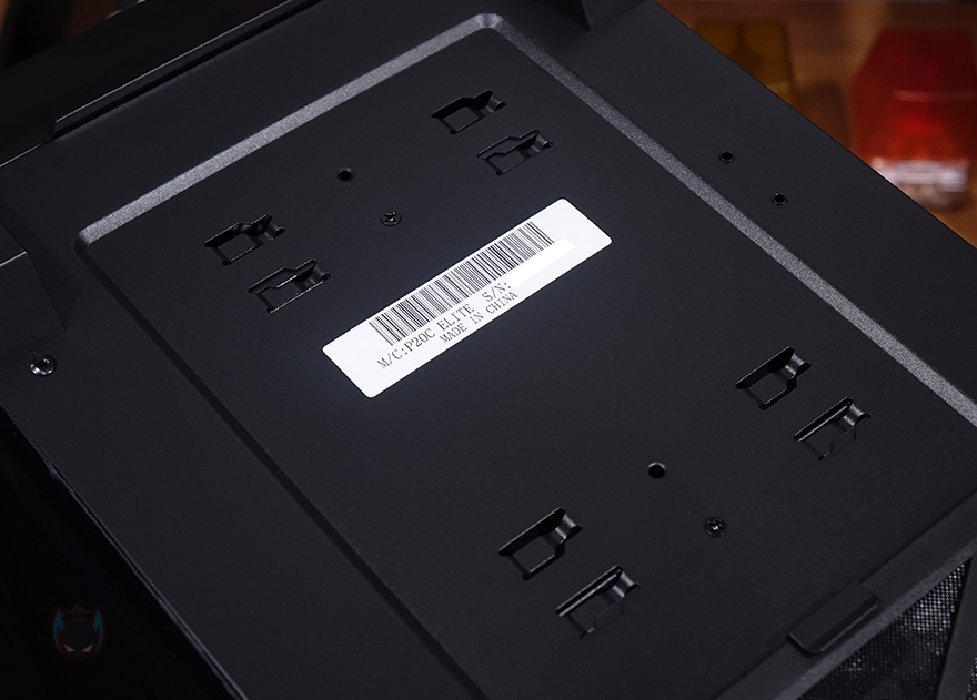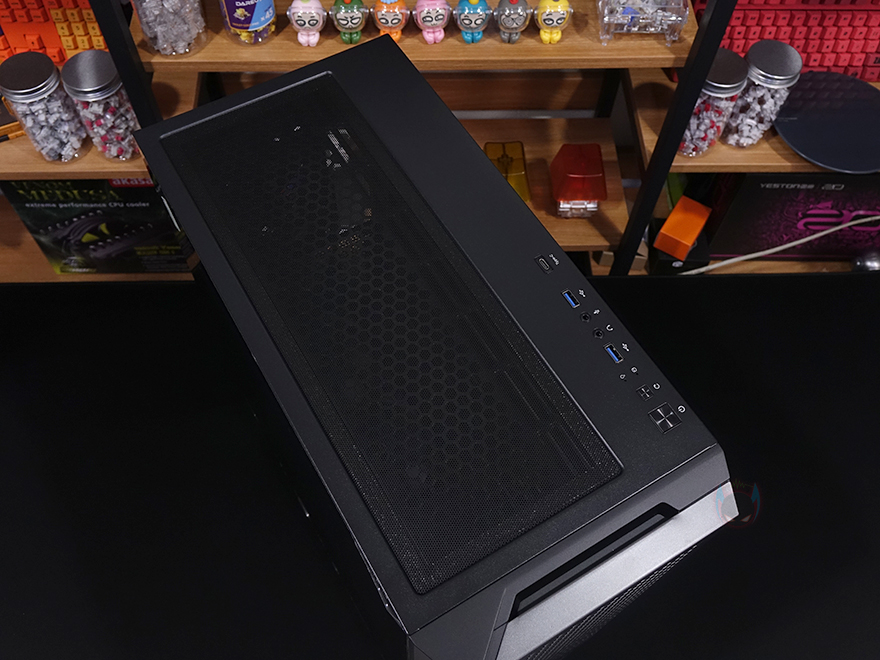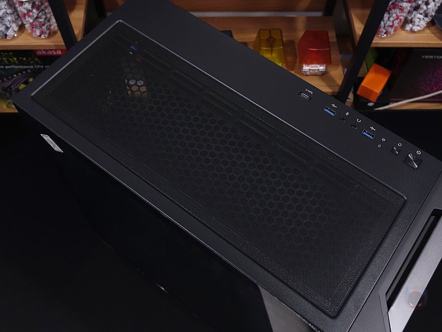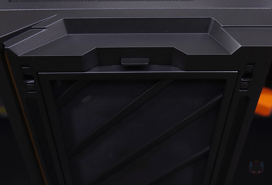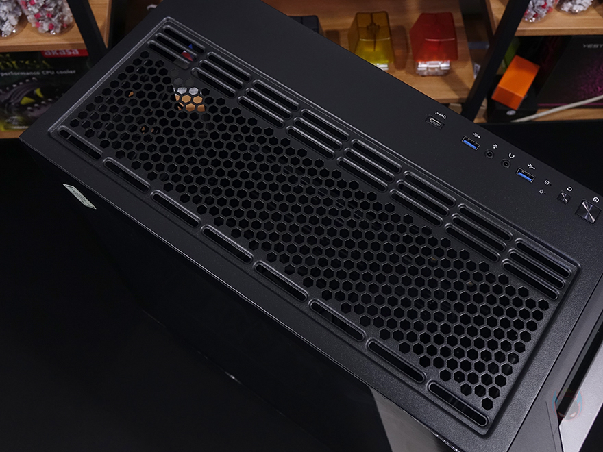 그리고, P20C ELITE 6FAN 케이스 상단에는 앞부분 맨 오른쪽에 버튼 및 포트가 배치되어 있는데, 전원/리셋/LED램프/USB 3.0/오디오/마이크/USB 3.0/USB 3.2 C타입 순으로 배치되어 있습니다. 그리고, 상단 역시 먼지필터가 자석방식으로 부착되어 있는데, 분리하면 상단 쿨링시스템을 갖출 수 있게 에어홀과 나사홀이 적용된 것을 확인할 수 있으며, 팬 기준으로는 120/140mm 모두 최대 3개까지 장착이 가능하고, 수랭쿨러 사용 시 전면과 동일하게 360mm 라디에이터까지 장착이 가능하죠.