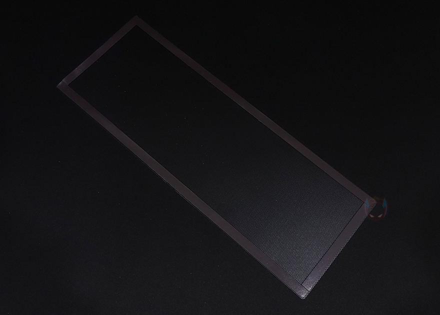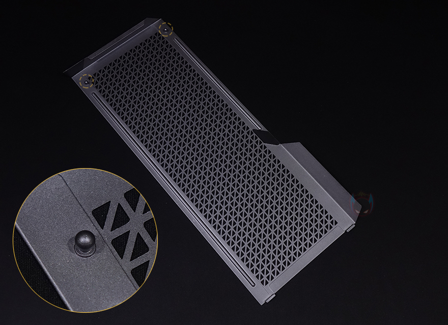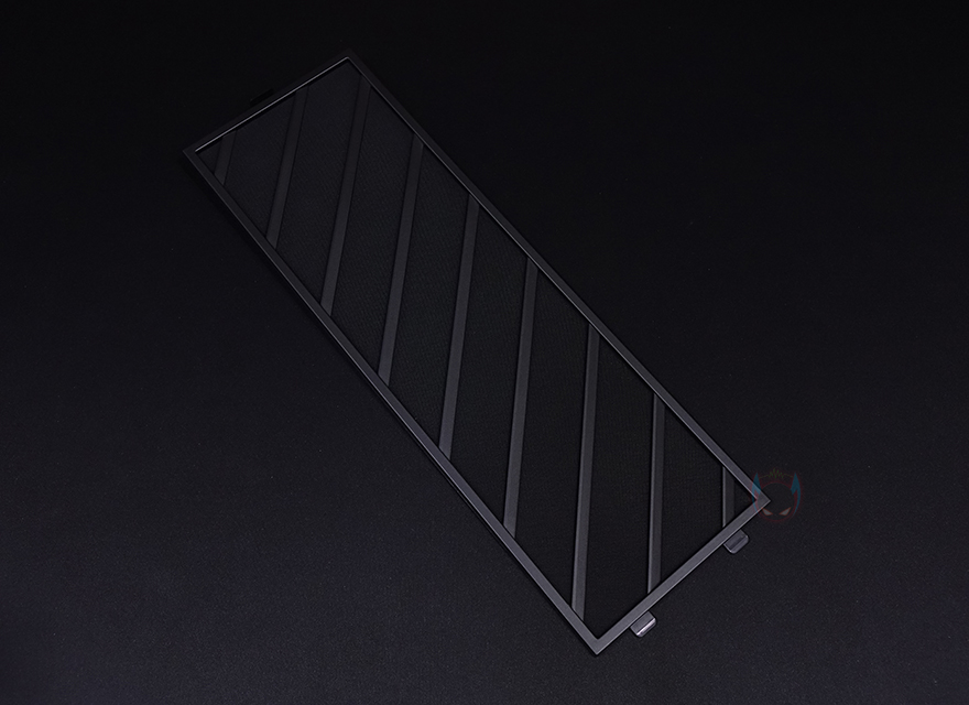 그리고, 전면 패널의 메탈 메쉬 부분은 위에서 앞으로 당기면 쉽게 분리가 되죠. 무나사의 푸쉬-핀 방식입니다. 메탈 메쉬 패널을 분리하면 안쪽에 분리형 먼지필터를 확인할 수 있는데, 역시 걸쇠방식으로 쉽게 분리가 됩니다. 즉, 전체 전면 패널을 분리할 필요 없이 청소와 팬 교체 편의성을 위해 분할식 분리를 적용했습니다. 먼지필터를 분리하면 전면 내부에는 전면쿨링시스템으로 120mm 팬이 기본 3개 장착된 것을 확인할 수 있는데, 맨 위부분에 여백을 통해 좌우로도 추가 나사홀-라인이 있는 것을 확인할 수 있습니다. 그래서, 전면에는 140mm 팬으로도 최대 3개까지 장착이 가능하고, 185mm 팬도 최대 2개까지 장착이 가능하죠. 물론, 수랭쿨러 장착 시 최대 360mm까지 라디에이터 장착도 가능합니다.