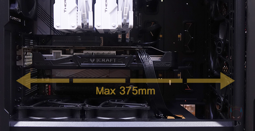 직접, 안텍 P20C ELITE 6FAN PC케이스를 사용해 시스템 조립을 해봤습니다. 일반 미들타워보다는 좀 더 높이가 있고, 폭도 있어서 내부 공간이 비교적 넓은 편이라 조립이 수월합니다. 파워서플라이 같은 경우에는 앞서 확인한 브라켓을 사용하면 슬라이딩 방식으로 쉽게 밀어넣을 수 있고, 모듈식 제품이라면 필요한 케이블만 사용해서 좀 더 케이블정리가 수월해지죠. CPU쿨러 같은경우에는 공랭쿨러 타워형 기준으로 최대 170mm 높이까지 지원하고 있어서 웬만한 타워형 쿨러들은 대부분 장착이 됩니다. 실제 장착한 쿨러도 157mm로 여유공간이 남는 것을 확인할 수 있죠. 또한, 메인보드 장착 후 케이스 상단 공간도 약 57mm정도 여유가 있어서 수랭쿨러 사용 시 표준 규격이라 할 수 있는 라디에이터 27mm와 팬 25mm 조합의 52mm 두께면 충분히 장착이 됩니다. 물론, 듀얼 팬 구성까지는 힘들죠. 그리고, 그래픽카드 같은경우에도 최대 375mm를 지원하고 있어서 왠만한 제품들은 다 장착이 가능하지만, 수랭쿨러 사용시 라디에이터를 전면에 장착한다면 길이가 320mm 정도로 제한되기 때문에 참고해야 하겠습니다.