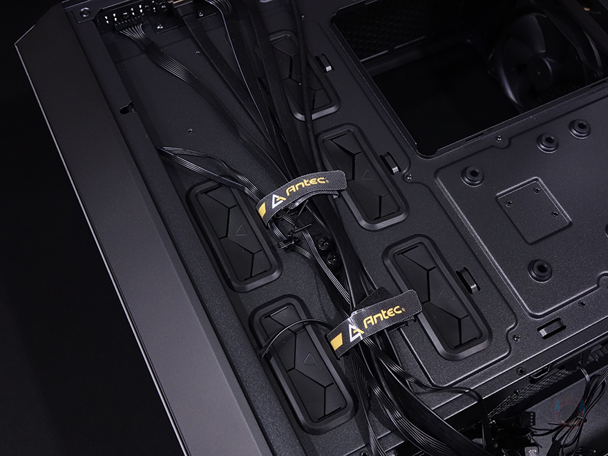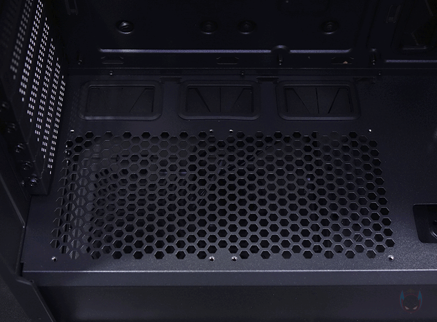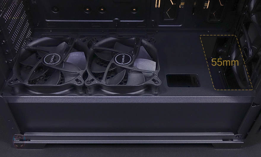 이제 안텍 P20C ELITE 6FAN PC케이스의 내부를 살펴보는데, 요즘 케이스답게 내부 하단에는 커버를 적용하고 있는데, 눈에 띄는 점은 기본 모델에서 제공되지 않았던 120mm 팬이 기본 2개 장착되어 있죠. 그래서, 앞서 언급했듯이 후면 배기 팬과 하단 팬, 그리고 전면 팬까지 총 6개의 팬이 기본 제공되는 것이 P20C ELITE 6FAN의 가장 큰 특징입니다. 물론, 시작에서 언급했듯 이건 한국에서 판매되는 제품 한해서죠. 그리고, 하단 커버 앞쪽에는 전면에 수랭쿨러 사용 시 라디에이터를 장착할 수 있게 최대 55mm 폭 공간을 마련해 놨으며, 하단 팬을 분리하면 커버에 에어홀과 바로 뒤로 케이블 정리홀도 적용된 것을 확인할 수 있습니다. 물론, 전후하단에 장착된 120mm 팬은 모두 동일한 팬이며, 팬 연결방식도 PWM입니다. 그래서, 앞에 구성품에서 확인했던 팬 3개를 함께 연결하고 작동시킬 수 있는 스플리터 케이블 2개가 제공되는 거죠.